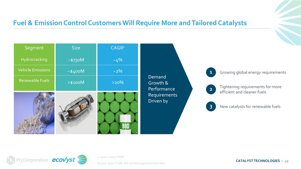 We Focus on Higher Growth Segments Where We Have Technology Advantages Renewable Materials Renewable Fuels >20% PE Silica Hydrogenation Based Catalyst Polypropylene Syngas PET PE MgCl Based Catalyst Hydrocracking (HCC) Hydrotreating (HT) Dehydrogenation Organic Synthesis Other Market Oxidation +3% Polymers Average Fluid Catalytic Aromatics Cracking (FCC) Platinum Group Vehicle Emission Control Metals (PGM) PVC LDPE 0% -1% Low High ecovyst Competitive Advantage Catalyst Technologies Focus Segments >$6B Non-focus Segments CATALYST TECHNOLOGIES / 47 1 Sources: TCGR, IHS and Management estimates 1 Market Growth CAGR (2020-2025)We Focus on Higher Growth Segments Where We Have Technology Advantages Renewable Materials Renewable Fuels >20% PE Silica Hydrogenation Based Catalyst Polypropylene Syngas PET PE MgCl Based Catalyst Hydrocracking (HCC) Hydrotreating (HT) Dehydrogenation Organic Synthesis Other Market Oxidation +3% Polymers Average Fluid Catalytic Aromatics Cracking (FCC) Platinum Group Vehicle Emission Control Metals (PGM) PVC LDPE 0% -1% Low High ecovyst Competitive Advantage Catalyst Technologies Focus Segments >$6B Non-focus Segments CATALYST TECHNOLOGIES / 47 1 Sources: TCGR, IHS and Management estimates 1 Market Growth CAGR (2020-2025)
