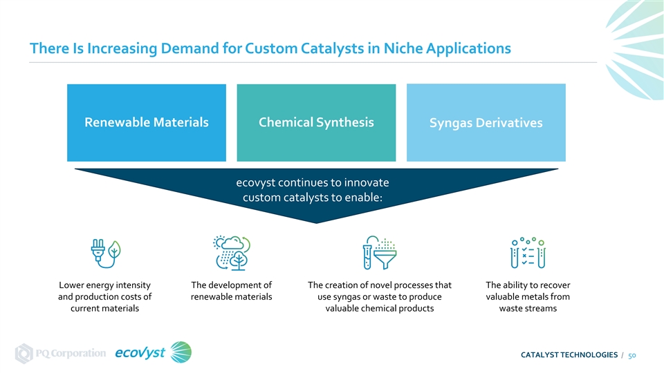 There Is Increasing Demand for Custom Catalysts in Niche Applications Renewable Materials Chemical Synthesis Syngas Derivatives ecovyst continues to innovate custom catalysts to enable: Lower energy intensity The development of The creation of novel processes that The ability to recover and production costs of renewable materials use syngas or waste to produce valuable metals from current materials valuable chemical products waste streams CATALYST TECHNOLOGIES / 50There Is Increasing Demand for Custom Catalysts in Niche Applications Renewable Materials Chemical Synthesis Syngas Derivatives ecovyst continues to innovate custom catalysts to enable: Lower energy intensity The development of The creation of novel processes that The ability to recover and production costs of renewable materials use syngas or waste to produce valuable metals from current materials valuable chemical products waste streams CATALYST TECHNOLOGIES / 50