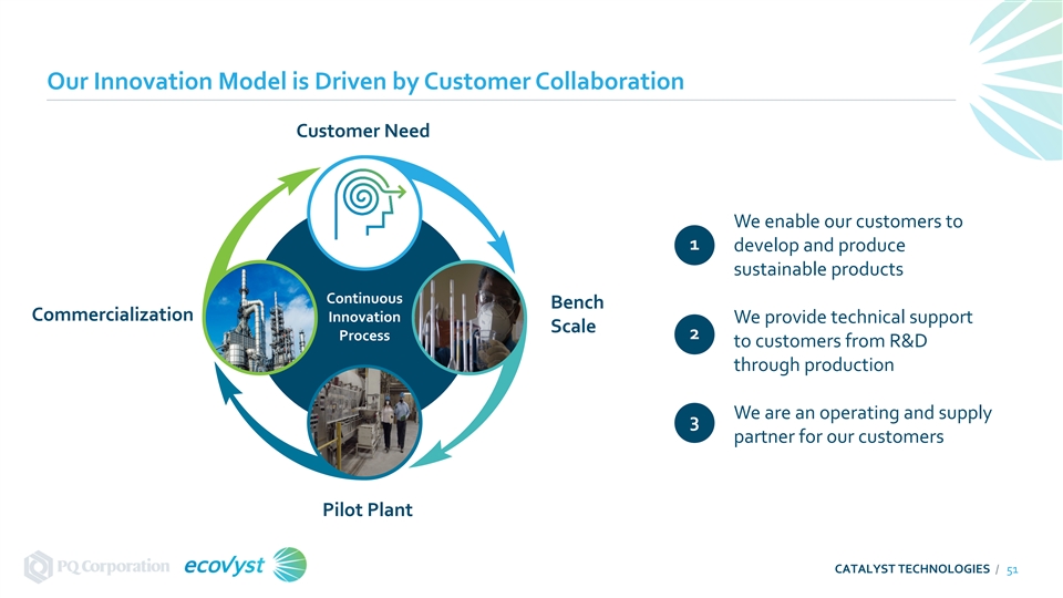 Our Innovation Model is Driven by Customer Collaboration Customer Need We enable our customers to 1 develop and produce sustainable products Continuous Bench Commercialization Innovation We provide technical support Scale 2 Process to customers from R&D through production We are an operating and supply 3 partner for our customers Pilot Plant CATALYST TECHNOLOGIES / 51Our Innovation Model is Driven by Customer Collaboration Customer Need We enable our customers to 1 develop and produce sustainable products Continuous Bench Commercialization Innovation We provide technical support Scale 2 Process to customers from R&D through production We are an operating and supply 3 partner for our customers Pilot Plant CATALYST TECHNOLOGIES / 51