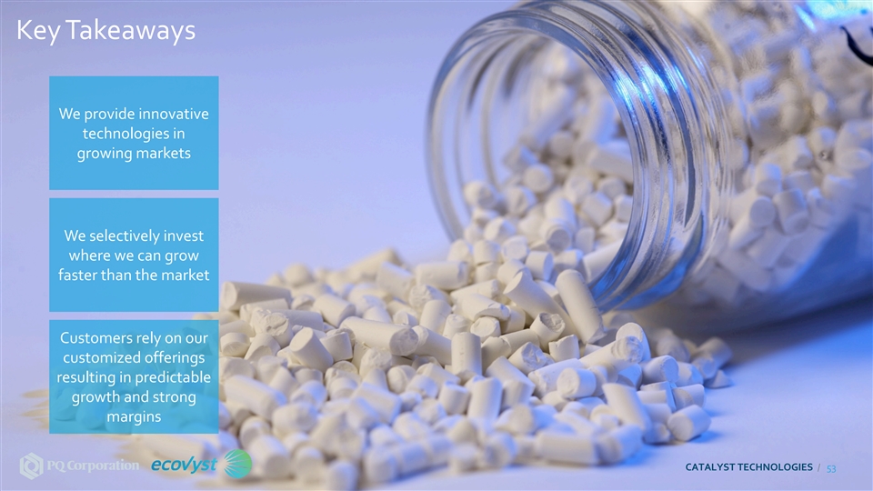 Organic Growth Outlook Organic Sales Growth Outlook Growth Drivers Preferred technology and increasing product Est. 10% CAGR offerings projected to drive >8% sales CAGR 1 in each of our three segments through 2025 8% CAGR Restored manufacturing network $170 efficiencies following 2020/2021 disruption $129 2 $144 37% ~39% expected to result in projected 15% Adjusted Average Average EBITDA CAGR through 2025 Adjusted Adjusted EBITDA EBITDA 1 1 Margin Margin $94 $86 $75 Upside potential from innovation pipeline 3 and potential M&A 2017 A 2019 A 2020 A 2025 E 2 Silica Catalyst Sales (M) 50% share of Zeolyst JV Sales (M) 1 Adjusted EBITDA margin calculation includes proportionate 50% share of Zeolyst Joint Venture 2 Historically the Catalysts segment CATALYST TECHNOLOGIES / 52Organic Growth Outlook Organic Sales Growth Outlook Growth Drivers Preferred technology and increasing product Est. 10% CAGR offerings projected to drive >8% sales CAGR 1 in each of our three segments through 2025 8% CAGR Restored manufacturing network $170 efficiencies following 2020/2021 disruption $129 2 $144 37% ~39% expected to result in projected 15% Adjusted Average Average EBITDA CAGR through 2025 Adjusted Adjusted EBITDA EBITDA 1 1 Margin Margin $94 $86 $75 Upside potential from innovation pipeline 3 and potential M&A 2017 A 2019 A 2020 A 2025 E 2 Silica Catalyst Sales (M) 50% share of Zeolyst JV Sales (M) 1 Adjusted EBITDA margin calculation includes proportionate 50% share of Zeolyst Joint Venture 2 Historically the Catalysts segment CATALYST TECHNOLOGIES / 52