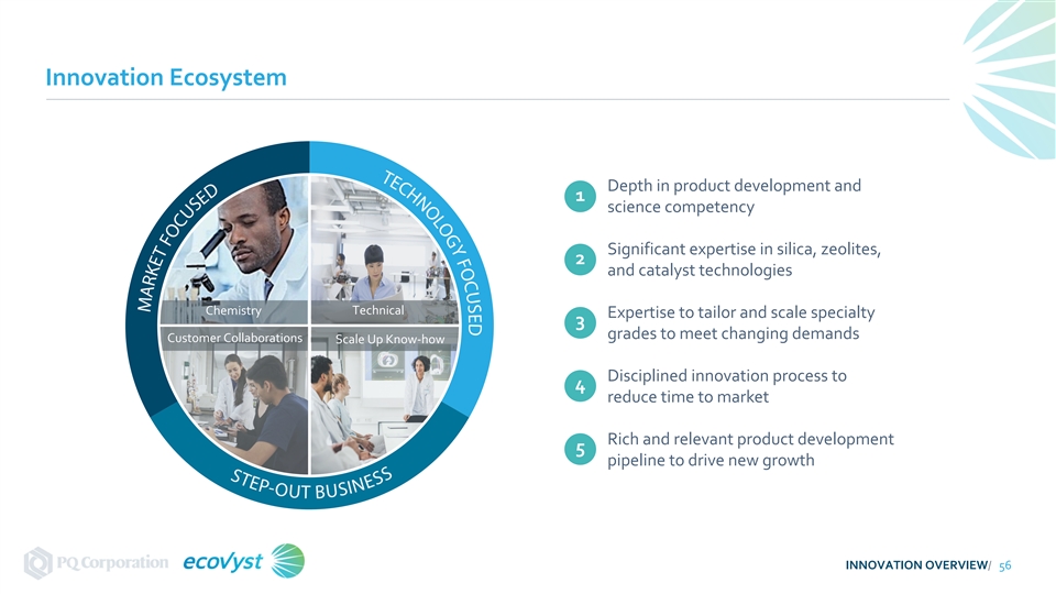 Innovation Ecosystem Depth in product development and 1 science competency Significant expertise in silica, zeolites, 2 and catalyst technologies Chemistry Technical Expertise to tailor and scale specialty 3 grades to meet changing demands Customer Collaborations Scale Up Know-how Disciplined innovation process to 4 reduce time to market Rich and relevant product development 5 pipeline to drive new growth INNOVATION OVERVIEW/ 56Innovation Ecosystem Depth in product development and 1 science competency Significant expertise in silica, zeolites, 2 and catalyst technologies Chemistry Technical Expertise to tailor and scale specialty 3 grades to meet changing demands Customer Collaborations Scale Up Know-how Disciplined innovation process to 4 reduce time to market Rich and relevant product development 5 pipeline to drive new growth INNOVATION OVERVIEW/ 56