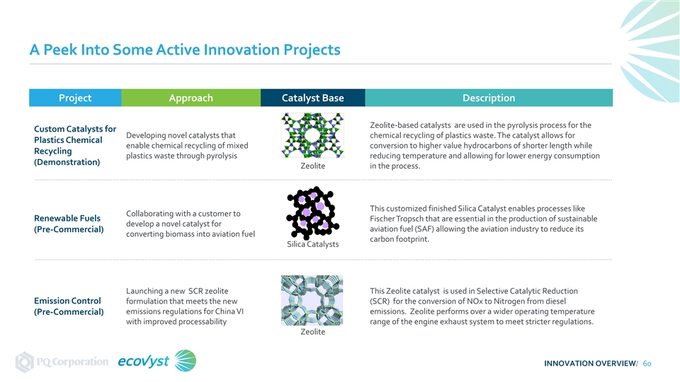 A Peek Into Some Active Innovation Projects Project Approach Catalyst Base Description Zeolite-based catalysts are used in the pyrolysis process for the Custom Catalysts for Developing novel catalysts that chemical recycling of plastics waste. The catalyst allows for Plastics Chemical enable chemical recycling of mixed conversion to higher value hydrocarbons of shorter length while Recycling plastics waste through pyrolysis reducing temperature and allowing for lower energy consumption (Demonstration) Zeolite in the process. This customized finished Silica Catalyst enables processes like Collaborating with a customer to Renewable Fuels Fischer Tropsch that are essential in the production of sustainable develop a novel catalyst for aviation fuel (SAF) allowing the aviation industry to reduce its (Pre-Commercial) converting biomass into aviation fuel carbon footprint. Silica Catalysts Enca Encaps psu ula lation tion Launching a new SCR zeolite This Zeolite catalyst is used in Selective Catalytic Reduction Emission Control formulation that meets the new (SCR) for the conversion of NOx to Nitrogen from diesel emissions regulations for China VI emissions. Zeolite performs over a wider operating temperature (Pre-Commercial) with improved processability range of the engine exhaust system to meet stricter regulations. Zeolite INNOVATION OVERVIEW/ 60A Peek Into Some Active Innovation Projects Project Approach Catalyst Base Description Zeolite-based catalysts are used in the pyrolysis process for the Custom Catalysts for Developing novel catalysts that chemical recycling of plastics waste. The catalyst allows for Plastics Chemical enable chemical recycling of mixed conversion to higher value hydrocarbons of shorter length while Recycling plastics waste through pyrolysis reducing temperature and allowing for lower energy consumption (Demonstration) Zeolite in the process. This customized finished Silica Catalyst enables processes like Collaborating with a customer to Renewable Fuels Fischer Tropsch that are essential in the production of sustainable develop a novel catalyst for aviation fuel (SAF) allowing the aviation industry to reduce its (Pre-Commercial) converting biomass into aviation fuel carbon footprint. Silica Catalysts Enca Encaps psu ula lation tion Launching a new SCR zeolite This Zeolite catalyst is used in Selective Catalytic Reduction Emission Control formulation that meets the new (SCR) for the conversion of NOx to Nitrogen from diesel emissions regulations for China VI emissions. Zeolite performs over a wider operating temperature (Pre-Commercial) with improved processability range of the engine exhaust system to meet stricter regulations. Zeolite INNOVATION OVERVIEW/ 60
