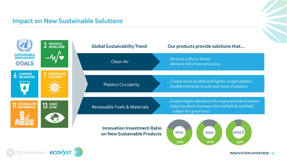 Impact on New Sustainable Solutions Global Sustainability Trend Our products provide solutions that… …Remove sulfur in diesel Clean Air …Remove NOx from emissions …Create more durable and lighter weight plastics Plastics Circularity …Enable chemical recycle and reuse of plastics …Enable higher alkylation for improved fuel economy …Help transform biomass into biofuels & synthetic Renewable Fuels & Materials rubber for green tires Innovation Investment Ratio 2015 2025 E 2020 on New Sustainable Products 60% 80% 90% INNOVATION OVERVIEW/ 61Impact on New Sustainable Solutions Global Sustainability Trend Our products provide solutions that… …Remove sulfur in diesel Clean Air …Remove NOx from emissions …Create more durable and lighter weight plastics Plastics Circularity …Enable chemical recycle and reuse of plastics …Enable higher alkylation for improved fuel economy …Help transform biomass into biofuels & synthetic Renewable Fuels & Materials rubber for green tires Innovation Investment Ratio 2015 2025 E 2020 on New Sustainable Products 60% 80% 90% INNOVATION OVERVIEW/ 61