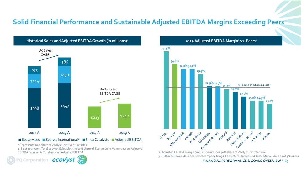 Solid Financial Performance and Sustainable Adjusted EBITDA Margins Exceeding Peers 1 2 3 Historical Sales and Adjusted EBITDA Growth (in millions) 2019 Adjusted EBITDA Margin vs. Peers 41.5% 7% Sales CAGR 34.6% $86 32.0% 32.0% $75 29.3% $170 $144 22.9% 22.7% 35% 35% All comp median (22.0%) 21.2% 19.7% 7% Adjusted EBITDA CAGR 17.2% 15.0% 14.9% 13.3% $447 $398 $242 $213 2017 A 2019 A 2017 A 2019 A Ecoservices Zeolyst International* Silica Catalysts Adjusted EBITDA *Represents 50% share of Zeolyst Joint Venture sales 1 Sales represent Total ecovyst Sales plus the 50% share of Zeolyst Joint Venture sales; Adjusted EBITDA represents Total ecovyst Adjusted EBITDA 2 Adjusted EBITDA margin calculation includes 50% share of Zeolyst Joint Venture 3 PQ for historical data and select company filings, FactSet, for forecasted data. Market data as of 3/26/2021 FINANCIAL PERFORMANCE & GOALS OVERVIEW / 65 Victrex Ecovyst CMC Materials Atotech W. R. Grace US Ecology Element Solutions Ashland Stericycle Clean Harbors Quaker Chemical H.B. Fuller InnospecSolid Financial Performance and Sustainable Adjusted EBITDA Margins Exceeding Peers 1 2 3 Historical Sales and Adjusted EBITDA Growth (in millions) 2019 Adjusted EBITDA Margin vs. Peers 41.5% 7% Sales CAGR 34.6% $86 32.0% 32.0% $75 29.3% $170 $144 22.9% 22.7% 35% 35% All comp median (22.0%) 21.2% 19.7% 7% Adjusted EBITDA CAGR 17.2% 15.0% 14.9% 13.3% $447 $398 $242 $213 2017 A 2019 A 2017 A 2019 A Ecoservices Zeolyst International* Silica Catalysts Adjusted EBITDA *Represents 50% share of Zeolyst Joint Venture sales 1 Sales represent Total ecovyst Sales plus the 50% share of Zeolyst Joint Venture sales; Adjusted EBITDA represents Total ecovyst Adjusted EBITDA 2 Adjusted EBITDA margin calculation includes 50% share of Zeolyst Joint Venture 3 PQ for historical data and select company filings, FactSet, for forecasted data. Market data as of 3/26/2021 FINANCIAL PERFORMANCE & GOALS OVERVIEW / 65 Victrex Ecovyst CMC Materials Atotech W. R. Grace US Ecology Element Solutions Ashland Stericycle Clean Harbors Quaker Chemical H.B. Fuller Innospec