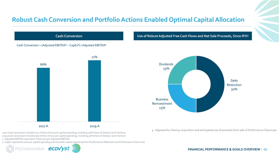 Robust Cash Conversion and Portfolio Actions Enabled Optimal Capital Allocation 3 Cash Conversion Use of Robust Adjusted Free Cash Flows and Net Sale Proceeds, Since IPO 1 2 1 Cash Conversion = (Adjusted EBITDA – CapEx ) / Adjusted EBITDA 71% 66% Dividends 25% Debt Reduction 50% Business Reinvestment 25% 2017 A 2019 A 3. Adjusted for Chem32 acquisition and anticipated use of proceeds from sale of Performance Chemicals 2017 Cash conversion includes $72 million of ecovyst capital spending, including 50% share of Zeolyst Joint Venture 2019 Cash conversion includes $70 million of ecovyst capital spending, including 50% share of Zeolyst Joint Venture 1. Adjusted EBITDA represents Total ecovyst Adjusted EBITDA 2. CapEx represents ecovyst capital spending and excludes capital spending from Performance Materials and Performance Chemicals FINANCIAL PERFORMANCE & GOALS OVERVIEW / 66Robust Cash Conversion and Portfolio Actions Enabled Optimal Capital Allocation 3 Cash Conversion Use of Robust Adjusted Free Cash Flows and Net Sale Proceeds, Since IPO 1 2 1 Cash Conversion = (Adjusted EBITDA – CapEx ) / Adjusted EBITDA 71% 66% Dividends 25% Debt Reduction 50% Business Reinvestment 25% 2017 A 2019 A 3. Adjusted for Chem32 acquisition and anticipated use of proceeds from sale of Performance Chemicals 2017 Cash conversion includes $72 million of ecovyst capital spending, including 50% share of Zeolyst Joint Venture 2019 Cash conversion includes $70 million of ecovyst capital spending, including 50% share of Zeolyst Joint Venture 1. Adjusted EBITDA represents Total ecovyst Adjusted EBITDA 2. CapEx represents ecovyst capital spending and excludes capital spending from Performance Materials and Performance Chemicals FINANCIAL PERFORMANCE & GOALS OVERVIEW / 66