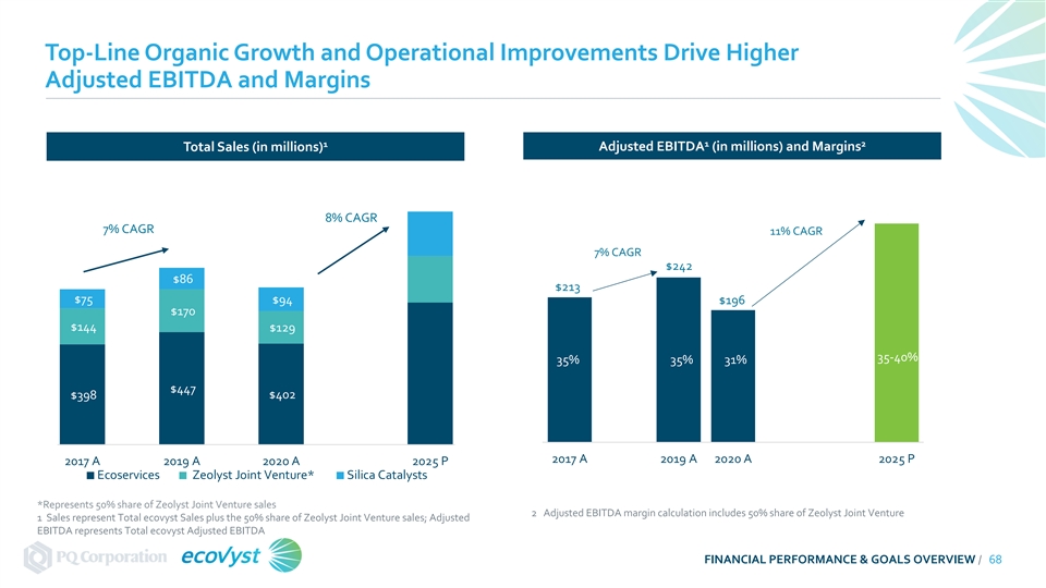 Top-Line Organic Growth and Operational Improvements Drive Higher Adjusted EBITDA and Margins 1 1 2 Adjusted EBITDA (in millions) and Margins Total Sales (in millions) 8% CAGR 7% CAGR 11% CAGR 7% CAGR $242 $86 $213 $75 $94 $196 $170 $144 $129 35-40% 35% 35% 31% $447 $398 $402 2017 A 2019 A 2020 A 2025 P 2017 A 2019 A 2020 A 2025 P Ecoservices Zeolyst Joint Venture* Silica Catalysts *Represents 50% share of Zeolyst Joint Venture sales 2 Adjusted EBITDA margin calculation includes 50% share of Zeolyst Joint Venture 1 Sales represent Total ecovyst Sales plus the 50% share of Zeolyst Joint Venture sales; Adjusted EBITDA represents Total ecovyst Adjusted EBITDA FINANCIAL PERFORMANCE & GOALS OVERVIEW / 68Top-Line Organic Growth and Operational Improvements Drive Higher Adjusted EBITDA and Margins 1 1 2 Adjusted EBITDA (in millions) and Margins Total Sales (in millions) 8% CAGR 7% CAGR 11% CAGR 7% CAGR $242 $86 $213 $75 $94 $196 $170 $144 $129 35-40% 35% 35% 31% $447 $398 $402 2017 A 2019 A 2020 A 2025 P 2017 A 2019 A 2020 A 2025 P Ecoservices Zeolyst Joint Venture* Silica Catalysts *Represents 50% share of Zeolyst Joint Venture sales 2 Adjusted EBITDA margin calculation includes 50% share of Zeolyst Joint Venture 1 Sales represent Total ecovyst Sales plus the 50% share of Zeolyst Joint Venture sales; Adjusted EBITDA represents Total ecovyst Adjusted EBITDA FINANCIAL PERFORMANCE & GOALS OVERVIEW / 68
