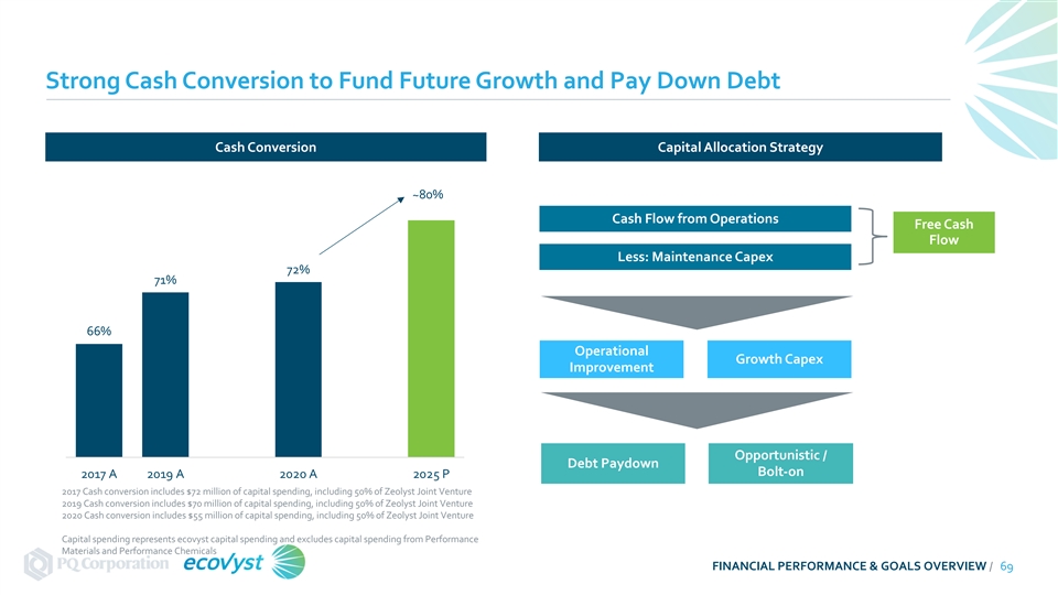 Strong Cash Conversion to Fund Future Growth and Pay Down Debt Cash Conversion Capital Allocation Strategy ~80% Cash Flow from Operations Free Cash Flow Less: Maintenance Capex 72% 71% 66% Operational Growth Capex Improvement Opportunistic / Debt Paydown Bolt-on 2017 A 2019 A 2020 A 2025 P 2017 Cash conversion includes $72 million of capital spending, including 50% of Zeolyst Joint Venture 2019 Cash conversion includes $70 million of capital spending, including 50% of Zeolyst Joint Venture 2020 Cash conversion includes $55 million of capital spending, including 50% of Zeolyst Joint Venture Capital spending represents ecovyst capital spending and excludes capital spending from Performance Materials and Performance Chemicals FINANCIAL PERFORMANCE & GOALS OVERVIEW / 69Strong Cash Conversion to Fund Future Growth and Pay Down Debt Cash Conversion Capital Allocation Strategy ~80% Cash Flow from Operations Free Cash Flow Less: Maintenance Capex 72% 71% 66% Operational Growth Capex Improvement Opportunistic / Debt Paydown Bolt-on 2017 A 2019 A 2020 A 2025 P 2017 Cash conversion includes $72 million of capital spending, including 50% of Zeolyst Joint Venture 2019 Cash conversion includes $70 million of capital spending, including 50% of Zeolyst Joint Venture 2020 Cash conversion includes $55 million of capital spending, including 50% of Zeolyst Joint Venture Capital spending represents ecovyst capital spending and excludes capital spending from Performance Materials and Performance Chemicals FINANCIAL PERFORMANCE & GOALS OVERVIEW / 69