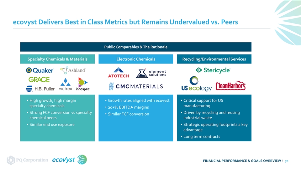 ecovyst Delivers Best in Class Metrics but Remains Undervalued vs. Peers Public Comparables & The Rationale Specialty Chemicals & Materials Electronic Chemicals Recycling/Environmental Services • High growth, high margin • Growth rates aligned with ecovyst • Critical support for US specialty chemicals manufacturing • 20+% EBITDA margins • Strong FCF conversion vs specialty • Driven by recycling and reusing • Similar FCF conversion chemical peers industrial waste • Similar end use exposure • Strategic operating footprints a key advantage • Long term contracts FINANCIAL PERFORMANCE & GOALS OVERVIEW / 70ecovyst Delivers Best in Class Metrics but Remains Undervalued vs. Peers Public Comparables & The Rationale Specialty Chemicals & Materials Electronic Chemicals Recycling/Environmental Services • High growth, high margin • Growth rates aligned with ecovyst • Critical support for US specialty chemicals manufacturing • 20+% EBITDA margins • Strong FCF conversion vs specialty • Driven by recycling and reusing • Similar FCF conversion chemical peers industrial waste • Similar end use exposure • Strategic operating footprints a key advantage • Long term contracts FINANCIAL PERFORMANCE & GOALS OVERVIEW / 70
