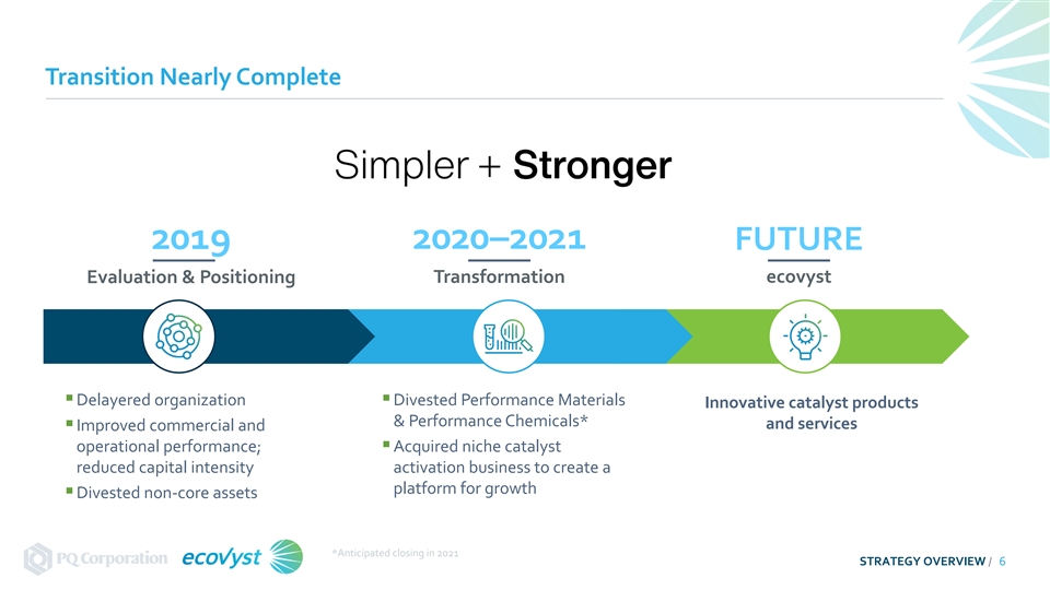 Transition Nearly Complete 2019 2020–2021 FUTURE Evaluation & Positioning Transformation ecovyst § Delayered organization § Divested Performance Materials Innovative catalyst products & Performance Chemicals* and services § Improved commercial and operational performance; § Acquired niche catalyst reduced capital intensity activation business to create a platform for growth § Divested non-core assets *Anticipated closing in 2021 STRATEGY OVERVIEW / 6Transition Nearly Complete 2019 2020–2021 FUTURE Evaluation & Positioning Transformation ecovyst § Delayered organization § Divested Performance Materials Innovative catalyst products & Performance Chemicals* and services § Improved commercial and operational performance; § Acquired niche catalyst reduced capital intensity activation business to create a platform for growth § Divested non-core assets *Anticipated closing in 2021 STRATEGY OVERVIEW / 6