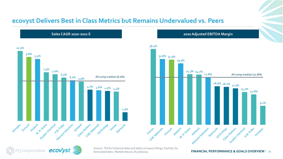ecovyst Delivers Best in Class Metrics but Remains Undervalued vs. Peers 2020 Cash Conversion & Current Net Debt/Adjusted EBITDA 2022 E EV/Adjusted EBITDA 93.2% 91.9% 16.2x 15.6x 15.4x 85.5% 14.9x 76.4% 75.9% All comp median (72.7%) 75.4% 72.7% All comp median (12.1x) 72.1% 12.4x 70.0% 12.2x 68.5% 12.0x 66.3% 66.1% 62.5% 11.0x 10.8x 10.8x 10.2x 9.9x 9.8x Source: PQ for historical data and select company filings, FactSet, for FINANCIAL PERFORMANCE & GOALS OVERVIEW / 72 forecasted data. Market data as of 3/26/2021 2.9x 3.2x 3.6x 4.1x 3.5x 3.0x NM 3.8x 1.8x NM 4.2x 1.9x 4.7x Element Solutions Quaker Chemical Atotech H.B. Fuller Stericycle Ashland Innospec Ecovyst CMC Materials Victrex US Ecology Clean Harbors W. R. Grace Quaker Chemical CMC Materials Victrex Stericycle Atotech Element Solutions Innospec Ashland Ecovyst W. R. Grace H.B. Fuller US Ecology Clean Harborsecovyst Delivers Best in Class Metrics but Remains Undervalued vs. Peers 2020 Cash Conversion & Current Net Debt/Adjusted EBITDA 2022 E EV/Adjusted EBITDA 93.2% 91.9% 16.2x 15.6x 15.4x 85.5% 14.9x 76.4% 75.9% All comp median (72.7%) 75.4% 72.7% All comp median (12.1x) 72.1% 12.4x 70.0% 12.2x 68.5% 12.0x 66.3% 66.1% 62.5% 11.0x 10.8x 10.8x 10.2x 9.9x 9.8x Source: PQ for historical data and select company filings, FactSet, for FINANCIAL PERFORMANCE & GOALS OVERVIEW / 72 forecasted data. Market data as of 3/26/2021 2.9x 3.2x 3.6x 4.1x 3.5x 3.0x NM 3.8x 1.8x NM 4.2x 1.9x 4.7x Element Solutions Quaker Chemical Atotech H.B. Fuller Stericycle Ashland Innospec Ecovyst CMC Materials Victrex US Ecology Clean Harbors W. R. Grace Quaker Chemical CMC Materials Victrex Stericycle Atotech Element Solutions Innospec Ashland Ecovyst W. R. Grace H.B. Fuller US Ecology Clean Harbors