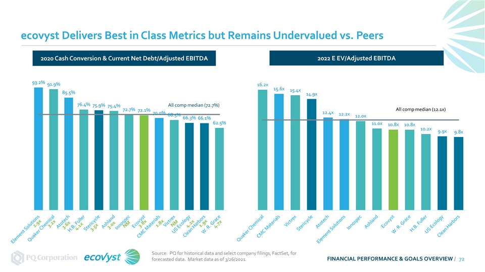 ecovyst Delivers Best in Class Metrics but Remains Undervalued vs. Peers Sales CAGR 2020-2022 E 2020 Adjusted EBITDA Margin 36.4% 10.5% 9.6% 9.3% 31.6% 31.3% 29.5% 7.3% 7.0% 24.3% 24.1% 22.8% All comp median (22.8%) 6.5% All comp median (6.0%) 6.1% 5.9% 18.5% 18.2% 17.5% 4.7% 4.6% 4.5% 4.4% 15.7% 14.6% 9.1% 1.3% Source: PQ for historical data and select company filings, FactSet, for FINANCIAL PERFORMANCE & GOALS OVERVIEW / 71 forecasted data. Market data as of 3/26/2021 Innospec Ecovyst Atotech W. R. Grace Quaker Chemical H.B. Fuller Element Solutions Ashland Clean Harbors CMC Materials US Ecology Victrex Stericycle Victrex CMC Materials Ecovyst Atotech W. R. Grace Ashland Element Solutions Stericycle US Ecology Clean Harbors Quaker Chemical H.B. Fuller Innospececovyst Delivers Best in Class Metrics but Remains Undervalued vs. Peers Sales CAGR 2020-2022 E 2020 Adjusted EBITDA Margin 36.4% 10.5% 9.6% 9.3% 31.6% 31.3% 29.5% 7.3% 7.0% 24.3% 24.1% 22.8% All comp median (22.8%) 6.5% All comp median (6.0%) 6.1% 5.9% 18.5% 18.2% 17.5% 4.7% 4.6% 4.5% 4.4% 15.7% 14.6% 9.1% 1.3% Source: PQ for historical data and select company filings, FactSet, for FINANCIAL PERFORMANCE & GOALS OVERVIEW / 71 forecasted data. Market data as of 3/26/2021 Innospec Ecovyst Atotech W. R. Grace Quaker Chemical H.B. Fuller Element Solutions Ashland Clean Harbors CMC Materials US Ecology Victrex Stericycle Victrex CMC Materials Ecovyst Atotech W. R. Grace Ashland Element Solutions Stericycle US Ecology Clean Harbors Quaker Chemical H.B. Fuller Innospec