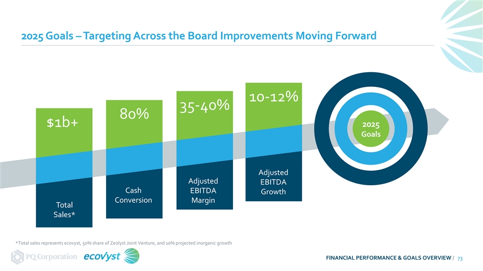 2025 Goals – Targeting Across the Board Improvements Moving Forward 10-12% 35-40% 80% $1b+ 2025 Goals Adjusted Adjusted EBITDA Cash EBITDA Growth Conversion Margin Total Sales* *Total sales represents ecovyst, 50% share of Zeolyst Joint Venture, and 10% projected inorganic growth FINANCIAL PERFORMANCE & GOALS OVERVIEW / 732025 Goals – Targeting Across the Board Improvements Moving Forward 10-12% 35-40% 80% $1b+ 2025 Goals Adjusted Adjusted EBITDA Cash EBITDA Growth Conversion Margin Total Sales* *Total sales represents ecovyst, 50% share of Zeolyst Joint Venture, and 10% projected inorganic growth FINANCIAL PERFORMANCE & GOALS OVERVIEW / 73