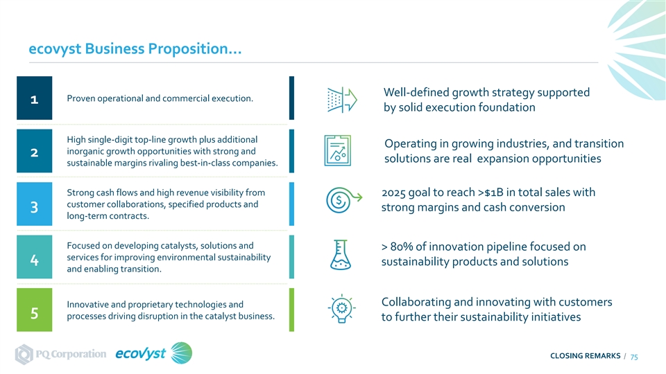 ecovyst Business Proposition… Well-defined growth strategy supported Proven operational and commercial execution. 1 by solid execution foundation High single-digit top-line growth plus additional Operating in growing industries, and transition inorganic growth opportunities with strong and 2 solutions are real expansion opportunities sustainable margins rivaling best-in-class companies. Strong cash flows and high revenue visibility from 2025 goal to reach >$1B in total sales with customer collaborations, specified products and 3 strong margins and cash conversion long-term contracts. Focused on developing catalysts, solutions and > 80% of innovation pipeline focused on services for improving environmental sustainability 4 sustainability products and solutions and enabling transition. Collaborating and innovating with customers Innovative and proprietary technologies and 5 processes driving disruption in the catalyst business. to further their sustainability initiatives CLOSING REMARKS / 75ecovyst Business Proposition… Well-defined growth strategy supported Proven operational and commercial execution. 1 by solid execution foundation High single-digit top-line growth plus additional Operating in growing industries, and transition inorganic growth opportunities with strong and 2 solutions are real expansion opportunities sustainable margins rivaling best-in-class companies. Strong cash flows and high revenue visibility from 2025 goal to reach >$1B in total sales with customer collaborations, specified products and 3 strong margins and cash conversion long-term contracts. Focused on developing catalysts, solutions and > 80% of innovation pipeline focused on services for improving environmental sustainability 4 sustainability products and solutions and enabling transition. Collaborating and innovating with customers Innovative and proprietary technologies and 5 processes driving disruption in the catalyst business. to further their sustainability initiatives CLOSING REMARKS / 75