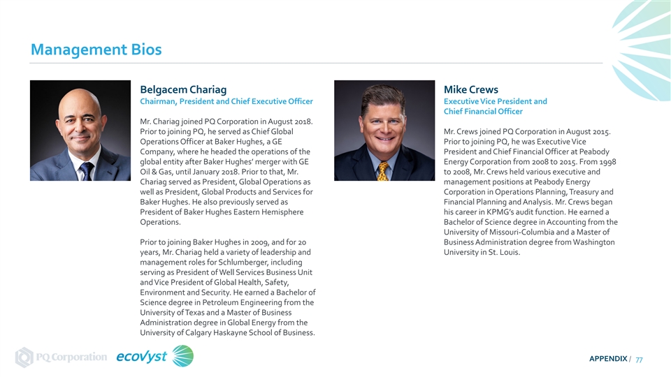 Management Bios Belgacem Chariag Mike Crews Chairman, President and Chief Executive Officer Executive Vice President and Chief Financial Officer Mr. Chariag joined PQ Corporation in August 2018. Prior to joining PQ, he served as Chief Global Mr. Crews joined PQ Corporation in August 2015. Operations Officer at Baker Hughes, a GE Prior to joining PQ, he was Executive Vice Company, where he headed the operations of the President and Chief Financial Officer at Peabody global entity after Baker Hughes’ merger with GE Energy Corporation from 2008 to 2015. From 1998 Oil & Gas, until January 2018. Prior to that, Mr. to 2008, Mr. Crews held various executive and Chariag served as President, Global Operations as management positions at Peabody Energy well as President, Global Products and Services for Corporation in Operations Planning, Treasury and Baker Hughes. He also previously served as Financial Planning and Analysis. Mr. Crews began President of Baker Hughes Eastern Hemisphere his career in KPMG’s audit function. He earned a Operations. Bachelor of Science degree in Accounting from the University of Missouri-Columbia and a Master of Prior to joining Baker Hughes in 2009, and for 20 Business Administration degree from Washington years, Mr. Chariag held a variety of leadership and University in St. Louis. management roles for Schlumberger, including serving as President of Well Services Business Unit and Vice President of Global Health, Safety, Environment and Security. He earned a Bachelor of Science degree in Petroleum Engineering from the University of Texas and a Master of Business Administration degree in Global Energy from the University of Calgary Haskayne School of Business. APPENDIX / 77Management Bios Belgacem Chariag Mike Crews Chairman, President and Chief Executive Officer Executive Vice President and Chief Financial Officer Mr. Chariag joined PQ Corporation in August 2018. Prior to joining PQ, he served as Chief Global Mr. Crews joined PQ Corporation in August 2015. Operations Officer at Baker Hughes, a GE Prior to joining PQ, he was Executive Vice Company, where he headed the operations of the President and Chief Financial Officer at Peabody global entity after Baker Hughes’ merger with GE Energy Corporation from 2008 to 2015. From 1998 Oil & Gas, until January 2018. Prior to that, Mr. to 2008, Mr. Crews held various executive and Chariag served as President, Global Operations as management positions at Peabody Energy well as President, Global Products and Services for Corporation in Operations Planning, Treasury and Baker Hughes. He also previously served as Financial Planning and Analysis. Mr. Crews began President of Baker Hughes Eastern Hemisphere his career in KPMG’s audit function. He earned a Operations. Bachelor of Science degree in Accounting from the University of Missouri-Columbia and a Master of Prior to joining Baker Hughes in 2009, and for 20 Business Administration degree from Washington years, Mr. Chariag held a variety of leadership and University in St. Louis. management roles for Schlumberger, including serving as President of Well Services Business Unit and Vice President of Global Health, Safety, Environment and Security. He earned a Bachelor of Science degree in Petroleum Engineering from the University of Texas and a Master of Business Administration degree in Global Energy from the University of Calgary Haskayne School of Business. APPENDIX / 77