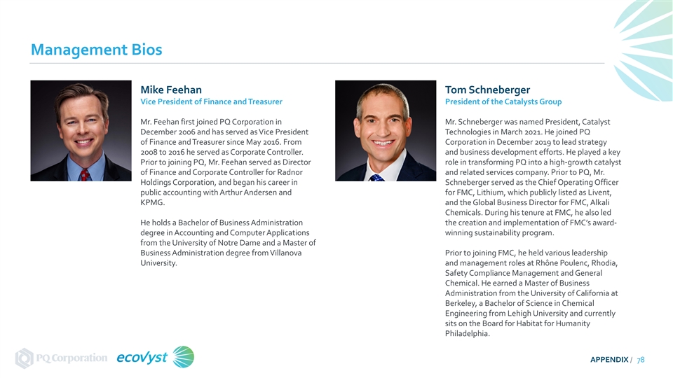 Management Bios Mike Feehan Tom Schneberger Vice President of Finance and Treasurer President of the Catalysts Group Mr. Feehan first joined PQ Corporation in Mr. Schneberger was named President, Catalyst December 2006 and has served as Vice President Technologies in March 2021. He joined PQ of Finance and Treasurer since May 2016. From Corporation in December 2019 to lead strategy 2008 to 2016 he served as Corporate Controller. and business development efforts. He played a key Prior to joining PQ, Mr. Feehan served as Director role in transforming PQ into a high-growth catalyst of Finance and Corporate Controller for Radnor and related services company. Prior to PQ, Mr. Holdings Corporation, and began his career in Schneberger served as the Chief Operating Officer public accounting with Arthur Andersen and for FMC, Lithium, which publicly listed as Livent, KPMG. and the Global Business Director for FMC, Alkali Chemicals. During his tenure at FMC, he also led He holds a Bachelor of Business Administration the creation and implementation of FMC’s award- degree in Accounting and Computer Applications winning sustainability program. from the University of Notre Dame and a Master of Business Administration degree from Villanova Prior to joining FMC, he held various leadership University. and management roles at Rhône Poulenc, Rhodia, Safety Compliance Management and General Chemical. He earned a Master of Business Administration from the University of California at Berkeley, a Bachelor of Science in Chemical Engineering from Lehigh University and currently sits on the Board for Habitat for Humanity Philadelphia. APPENDIX / 78Management Bios Mike Feehan Tom Schneberger Vice President of Finance and Treasurer President of the Catalysts Group Mr. Feehan first joined PQ Corporation in Mr. Schneberger was named President, Catalyst December 2006 and has served as Vice President Technologies in March 2021. He joined PQ of Finance and Treasurer since May 2016. From Corporation in December 2019 to lead strategy 2008 to 2016 he served as Corporate Controller. and business development efforts. He played a key Prior to joining PQ, Mr. Feehan served as Director role in transforming PQ into a high-growth catalyst of Finance and Corporate Controller for Radnor and related services company. Prior to PQ, Mr. Holdings Corporation, and began his career in Schneberger served as the Chief Operating Officer public accounting with Arthur Andersen and for FMC, Lithium, which publicly listed as Livent, KPMG. and the Global Business Director for FMC, Alkali Chemicals. During his tenure at FMC, he also led He holds a Bachelor of Business Administration the creation and implementation of FMC’s award- degree in Accounting and Computer Applications winning sustainability program. from the University of Notre Dame and a Master of Business Administration degree from Villanova Prior to joining FMC, he held various leadership University. and management roles at Rhône Poulenc, Rhodia, Safety Compliance Management and General Chemical. He earned a Master of Business Administration from the University of California at Berkeley, a Bachelor of Science in Chemical Engineering from Lehigh University and currently sits on the Board for Habitat for Humanity Philadelphia. APPENDIX / 78