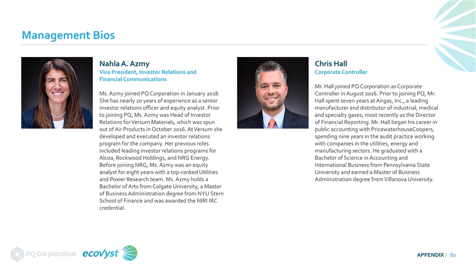 Management Bios Nahla A. Azmy Chris Hall Vice President, Investor Relations and Corporate Controller Financial Communications Mr. Hall joined PQ Corporation as Corporate Ms. Azmy joined PQ Corporation in January 2018. Controller in August 2016. Prior to joining PQ, Mr. She has nearly 20 years of experience as a senior Hall spent seven years at Airgas, Inc., a leading investor relations officer and equity analyst. Prior manufacturer and distributor of industrial, medical to joining PQ, Ms. Azmy was Head of Investor and specialty gases, most recently as the Director Relations for Versum Materials, which was spun of Financial Reporting. Mr. Hall began his career in out of Air Products in October 2016. At Versum she public accounting with PricewaterhouseCoopers, developed and executed an investor relations spending nine years in the audit practice working program for the company. Her previous roles with companies in the utilities, energy and included leading investor relations programs for manufacturing sectors. He graduated with a Alcoa, Rockwood Holdings, and NRG Energy. Bachelor of Science in Accounting and Before joining NRG, Ms. Azmy was an equity International Business from Pennsylvania State analyst for eight years with a top-ranked Utilities University and earned a Master of Business and Power Research team. Ms. Azmy holds a Administration degree from Villanova University. Bachelor of Arts from Colgate University, a Master of Business Administration degree from NYU Stern School of Finance and was awarded the NIRI IRC credential. APPENDIX / 80Management Bios Nahla A. Azmy Chris Hall Vice President, Investor Relations and Corporate Controller Financial Communications Mr. Hall joined PQ Corporation as Corporate Ms. Azmy joined PQ Corporation in January 2018. Controller in August 2016. Prior to joining PQ, Mr. She has nearly 20 years of experience as a senior Hall spent seven years at Airgas, Inc., a leading investor relations officer and equity analyst. Prior manufacturer and distributor of industrial, medical to joining PQ, Ms. Azmy was Head of Investor and specialty gases, most recently as the Director Relations for Versum Materials, which was spun of Financial Reporting. Mr. Hall began his career in out of Air Products in October 2016. At Versum she public accounting with PricewaterhouseCoopers, developed and executed an investor relations spending nine years in the audit practice working program for the company. Her previous roles with companies in the utilities, energy and included leading investor relations programs for manufacturing sectors. He graduated with a Alcoa, Rockwood Holdings, and NRG Energy. Bachelor of Science in Accounting and Before joining NRG, Ms. Azmy was an equity International Business from Pennsylvania State analyst for eight years with a top-ranked Utilities University and earned a Master of Business and Power Research team. Ms. Azmy holds a Administration degree from Villanova University. Bachelor of Arts from Colgate University, a Master of Business Administration degree from NYU Stern School of Finance and was awarded the NIRI IRC credential. APPENDIX / 80