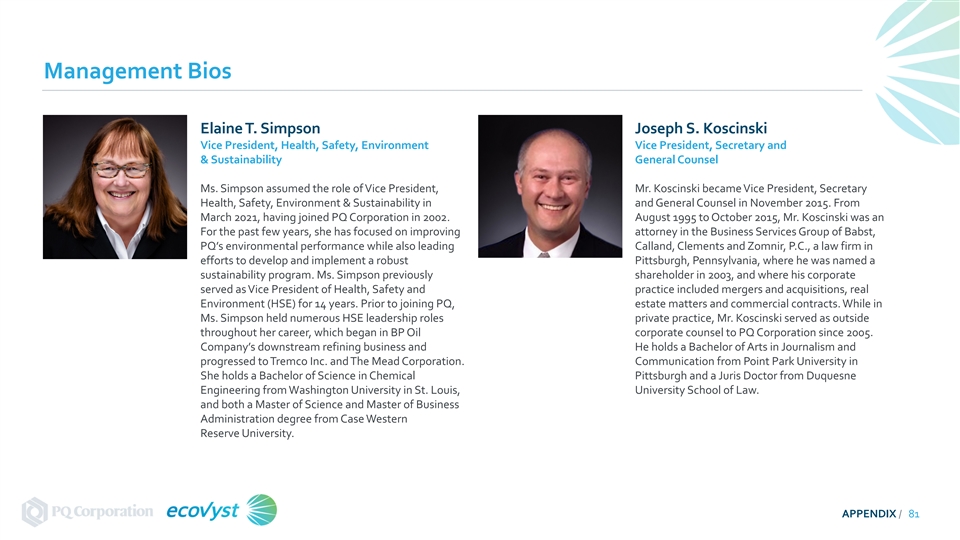 Management Bios Elaine T. Simpson Joseph S. Koscinski Vice President, Health, Safety, Environment Vice President, Secretary and & Sustainability General Counsel Ms. Simpson assumed the role of Vice President, Mr. Koscinski became Vice President, Secretary Health, Safety, Environment & Sustainability in and General Counsel in November 2015. From March 2021, having joined PQ Corporation in 2002. August 1995 to October 2015, Mr. Koscinski was an For the past few years, she has focused on improving attorney in the Business Services Group of Babst, PQ’s environmental performance while also leading Calland, Clements and Zomnir, P.C., a law firm in efforts to develop and implement a robust Pittsburgh, Pennsylvania, where he was named a sustainability program. Ms. Simpson previously shareholder in 2003, and where his corporate served as Vice President of Health, Safety and practice included mergers and acquisitions, real Environment (HSE) for 14 years. Prior to joining PQ, estate matters and commercial contracts. While in Ms. Simpson held numerous HSE leadership roles private practice, Mr. Koscinski served as outside throughout her career, which began in BP Oil corporate counsel to PQ Corporation since 2005. Company’s downstream refining business and He holds a Bachelor of Arts in Journalism and progressed to Tremco Inc. and The Mead Corporation. Communication from Point Park University in She holds a Bachelor of Science in Chemical Pittsburgh and a Juris Doctor from Duquesne Engineering from Washington University in St. Louis, University School of Law. and both a Master of Science and Master of Business Administration degree from Case Western Reserve University. APPENDIX / 81Management Bios Elaine T. Simpson Joseph S. Koscinski Vice President, Health, Safety, Environment Vice President, Secretary and & Sustainability General Counsel Ms. Simpson assumed the role of Vice President, Mr. Koscinski became Vice President, Secretary Health, Safety, Environment & Sustainability in and General Counsel in November 2015. From March 2021, having joined PQ Corporation in 2002. August 1995 to October 2015, Mr. Koscinski was an For the past few years, she has focused on improving attorney in the Business Services Group of Babst, PQ’s environmental performance while also leading Calland, Clements and Zomnir, P.C., a law firm in efforts to develop and implement a robust Pittsburgh, Pennsylvania, where he was named a sustainability program. Ms. Simpson previously shareholder in 2003, and where his corporate served as Vice President of Health, Safety and practice included mergers and acquisitions, real Environment (HSE) for 14 years. Prior to joining PQ, estate matters and commercial contracts. While in Ms. Simpson held numerous HSE leadership roles private practice, Mr. Koscinski served as outside throughout her career, which began in BP Oil corporate counsel to PQ Corporation since 2005. Company’s downstream refining business and He holds a Bachelor of Arts in Journalism and progressed to Tremco Inc. and The Mead Corporation. Communication from Point Park University in She holds a Bachelor of Science in Chemical Pittsburgh and a Juris Doctor from Duquesne Engineering from Washington University in St. Louis, University School of Law. and both a Master of Science and Master of Business Administration degree from Case Western Reserve University. APPENDIX / 81