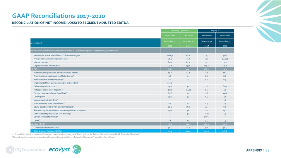 GAAP Reconciliations 2017-2020 RECONCILIATION OF NET INCOME (LOSS) TO SEGMENT ADJUSTED EBITDA Continuing Operation Legacy PQ Year Ended Year Ended Year Ended Year Ended December 31, December 31, December 31, December 31, ($ in millions) 2020 2019 2018 2017 Reconciliation of net income (loss) attributable to PQ Group Holdings Inc. to Segment Adjusted EBITDA Net (loss) income attributable to PQ Group Holdings Inc. (176.3) 65.1 58.3 57.6 Provision for (benefit from) income taxes (48.1) 39.7 29.0 (119.2) Interest expense 67.0 87.1 113.7 179.0 Depreciation and amortization 151.8 151.8 185.2 177.1 EBITDA (5.6) 343.7 386.2 294.5 a Joint venture depreciation, amortization and interest 14.7 14.7 12.6 11.1 b Amortization of investment in affiliate step-up 6.6 7.5 6.6 8.6 c Amortization of inventory step-up — — 1.6 0.9 Impairment of fixed assets, intangibles and goodwill 260.0 — — — Debt extinguishment costs 25.0 3.4 7.8 61.9 d Net (gain) loss on asset disposals (0.1) (13.2) 6.6 5.8 e Foreign currency exchange (gain) loss (4.2) 2.4 13.8 25.8 f LIFO expense (5.2) 9.7 8.4 3.7 g Management advisory fees — — — 3.8 h Transaction and other related costs 8.6 0.4 0.9 7.4 Equity-based and other non-cash compensation 21.5 16.2 8.8 19.5 I Restructuring, integration and business optimization expenses 15.6 3.6 14.0 13.2 j Defined benefit plan pension cost (benefit) — 3.0 (0.8) 2.9 k Gain on contract termination — — (20.6) — l Other 1.1 2.5 7.4 4.9 Adjusted EBITDA 338.0 393.9 464.0 453.3 Unallocated corporate costs 36.1 41.0 37.0 30.5 1 Total Segment Adjusted EBITDA 374.1 434.9 501.0 483.8 1. For additional information with respect to each adjustment, see “Descriptions for Reconciliation of Non-GAAP Financial Measures” *Rounding discrepancies may arise when rounding results from dollars (in thousands) to dollars (in millions) APPENDIX / 82GAAP Reconciliations 2017-2020 RECONCILIATION OF NET INCOME (LOSS) TO SEGMENT ADJUSTED EBITDA Continuing Operation Legacy PQ Year Ended Year Ended Year Ended Year Ended December 31, December 31, December 31, December 31, ($ in millions) 2020 2019 2018 2017 Reconciliation of net income (loss) attributable to PQ Group Holdings Inc. to Segment Adjusted EBITDA Net (loss) income attributable to PQ Group Holdings Inc. (176.3) 65.1 58.3 57.6 Provision for (benefit from) income taxes (48.1) 39.7 29.0 (119.2) Interest expense 67.0 87.1 113.7 179.0 Depreciation and amortization 151.8 151.8 185.2 177.1 EBITDA (5.6) 343.7 386.2 294.5 a Joint venture depreciation, amortization and interest 14.7 14.7 12.6 11.1 b Amortization of investment in affiliate step-up 6.6 7.5 6.6 8.6 c Amortization of inventory step-up — — 1.6 0.9 Impairment of fixed assets, intangibles and goodwill 260.0 — — — Debt extinguishment costs 25.0 3.4 7.8 61.9 d Net (gain) loss on asset disposals (0.1) (13.2) 6.6 5.8 e Foreign currency exchange (gain) loss (4.2) 2.4 13.8 25.8 f LIFO expense (5.2) 9.7 8.4 3.7 g Management advisory fees — — — 3.8 h Transaction and other related costs 8.6 0.4 0.9 7.4 Equity-based and other non-cash compensation 21.5 16.2 8.8 19.5 I Restructuring, integration and business optimization expenses 15.6 3.6 14.0 13.2 j Defined benefit plan pension cost (benefit) — 3.0 (0.8) 2.9 k Gain on contract termination — — (20.6) — l Other 1.1 2.5 7.4 4.9 Adjusted EBITDA 338.0 393.9 464.0 453.3 Unallocated corporate costs 36.1 41.0 37.0 30.5 1 Total Segment Adjusted EBITDA 374.1 434.9 501.0 483.8 1. For additional information with respect to each adjustment, see “Descriptions for Reconciliation of Non-GAAP Financial Measures” *Rounding discrepancies may arise when rounding results from dollars (in thousands) to dollars (in millions) APPENDIX / 82
