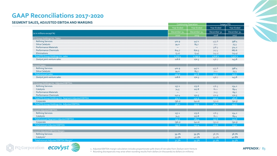GAAP Reconciliations 2017-2020 SEGMENT SALES, ADJUSTED EBITDA AND MARGINS Continuing Operation Legacy PQ Year Ended Year Ended Year Ended Year Ended December 31, December 31, December 31 December 31, ($ in millions except %) 2020 2019 2018 2017 PQ Group Holdings Inc. Sales: Refining Services 401.9 447.1 455.6 398.4 Silica Catalysts 94.0 85.7 72.1 75.3 Performance Materials — — 378.3 324.2 Performance Chemicals 614.7 670.5 717.3 687.6 Eliminations (3.2) (3.4) (15.1) (13.4) Total PQ Group Holdings Inc. sales 1,107.4 1,199.9 1,472.1 1,608.2 Zeolyst joint venture sales 128.6 170.3 156.7 143.8 ecovyst Sales: Refining Services 401.9 447.1 455.6 398.4 Silica Catalysts 94.0 85.7 72.1 75.3 Total ecovyst sales 495.9 532.8 473.7 527.7 Zeolyst joint venture sales 128.6 170.3 156.7 143.8 PQ Group Holdings Inc. Adjusted EBITDA: Refining Services 157.2 175.6 176.5 154.2 Catalysts 74.5 107.8 81.1 89.4 Performance Materials — — 72.5 69.7 Performance Chemicals 142.4 151.5 170.9 170.5 Total PQ Group Holdings Inc. Segment Adjusted EBITDA 374.1 434.9 501.0 483.8 Corporate (36.1) (41.0) (37.0) (30.5) Total PQ Group Holdings Inc. Adjusted EBITDA 338.0 393.9 464.0 453.3 ecovyst Adjusted EBITDA: Refining Services 157.2 175.6 176.5 154.2 Catalysts 74.5 107.8 81.1 89.4 Total ecovyst Segment Adjusted EBITDA 231.7 283.4 257.6 243.6 Corporate (36.1) (41.0) (37.0) (30.5) Total ecovyst Adjusted EBITDA 195.6 242.4 213.1 220.6 ecovyst Adjusted EBITDA Margin: Refining Services 39.1% 39.3% 38.7% 38.7% 1 Catalysts 33.5% 42.1% 35.4% 40.8% 1 Total ecovyst Adjusted EBITDA Margin 31.3% 34.5% 34.5% 32.2% APPENDIX / 83 1. Adjusted EBITDA margin calculation includes proportionate 50% share of net sales from Zeolyst Joint Venture * Rounding discrepancies may arise when rounding results from dollars (in thousands) to dollars (in millions)GAAP Reconciliations 2017-2020 SEGMENT SALES, ADJUSTED EBITDA AND MARGINS Continuing Operation Legacy PQ Year Ended Year Ended Year Ended Year Ended December 31, December 31, December 31 December 31, ($ in millions except %) 2020 2019 2018 2017 PQ Group Holdings Inc. Sales: Refining Services 401.9 447.1 455.6 398.4 Silica Catalysts 94.0 85.7 72.1 75.3 Performance Materials — — 378.3 324.2 Performance Chemicals 614.7 670.5 717.3 687.6 Eliminations (3.2) (3.4) (15.1) (13.4) Total PQ Group Holdings Inc. sales 1,107.4 1,199.9 1,472.1 1,608.2 Zeolyst joint venture sales 128.6 170.3 156.7 143.8 ecovyst Sales: Refining Services 401.9 447.1 455.6 398.4 Silica Catalysts 94.0 85.7 72.1 75.3 Total ecovyst sales 495.9 532.8 473.7 527.7 Zeolyst joint venture sales 128.6 170.3 156.7 143.8 PQ Group Holdings Inc. Adjusted EBITDA: Refining Services 157.2 175.6 176.5 154.2 Catalysts 74.5 107.8 81.1 89.4 Performance Materials — — 72.5 69.7 Performance Chemicals 142.4 151.5 170.9 170.5 Total PQ Group Holdings Inc. Segment Adjusted EBITDA 374.1 434.9 501.0 483.8 Corporate (36.1) (41.0) (37.0) (30.5) Total PQ Group Holdings Inc. Adjusted EBITDA 338.0 393.9 464.0 453.3 ecovyst Adjusted EBITDA: Refining Services 157.2 175.6 176.5 154.2 Catalysts 74.5 107.8 81.1 89.4 Total ecovyst Segment Adjusted EBITDA 231.7 283.4 257.6 243.6 Corporate (36.1) (41.0) (37.0) (30.5) Total ecovyst Adjusted EBITDA 195.6 242.4 213.1 220.6 ecovyst Adjusted EBITDA Margin: Refining Services 39.1% 39.3% 38.7% 38.7% 1 Catalysts 33.5% 42.1% 35.4% 40.8% 1 Total ecovyst Adjusted EBITDA Margin 31.3% 34.5% 34.5% 32.2% APPENDIX / 83 1. Adjusted EBITDA margin calculation includes proportionate 50% share of net sales from Zeolyst Joint Venture * Rounding discrepancies may arise when rounding results from dollars (in thousands) to dollars (in millions)