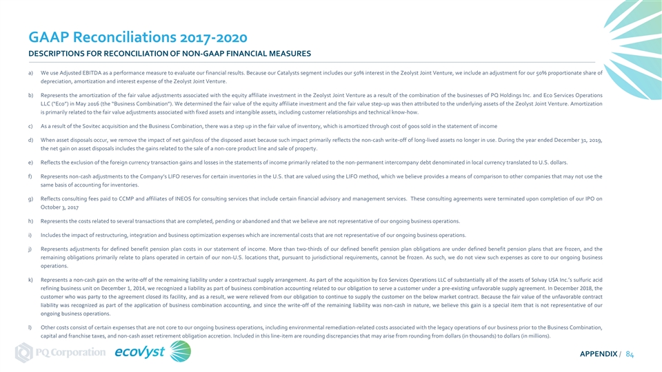 GAAP Reconciliations 2017-2020 DESCRIPTIONS FOR RECONCILIATION OF NON-GAAP FINANCIAL MEASURES a) WeuseAdjustedEBITDAasaperformancemeasuretoevaluateourfinancialresults.BecauseourCatalystssegmentincludesour50%interestintheZeolystJointVenture,weincludeanadjustmentforour50%proportionateshareof depreciation,amortizationandinterestexpenseoftheZeolystJointVenture. b) Representsthe amortization of the fair value adjustmentsassociated with the equity affiliate investment in the Zeolyst Joint Venture as aresult of the combination of the businesses of PQ HoldingsInc. and EcoServicesOperations LLC(“Eco”)inMay2016(the“BusinessCombination”).Wedeterminedthefairvalueoftheequityaffiliateinvestmentandthefairvaluestep-upwasthenattributedtotheunderlyingassetsoftheZeolystJointVenture.Amortization isprimarilyrelatedtothefairvalueadjustmentsassociatedwithfixedassetsandintangibleassets,includingcustomerrelationshipsandtechnicalknow-how. c) AsaresultoftheSovitecacquisitionandtheBusinessCombination,therewasastepupinthefairvalueofinventory,whichisamortizedthroughcostofgoossoldinthestatementofincome d) When asset disposalsoccur,we remove the impact of net gain/lossof the disposedasset because suchimpact primarily reflectsthe non-cash write-off of long-livedassetsnolonger in use.Duringtheyear endedDecember 31,2019, thenetgainonassetdisposalsincludesthegainsrelatedtothesaleofanon-coreproductlineandsaleofproperty. e) Reflectstheexclusionoftheforeigncurrencytransactiongainsandlossesinthestatementsofincomeprimarilyrelatedtothenon-permanentintercompanydebtdenominatedinlocalcurrencytranslatedtoU.S.dollars. f) Representsnon-cashadjustmentstotheCompany’sLIFOreservesforcertaininventoriesintheU.S.thatarevaluedusingtheLIFOmethod,whichwebelieveprovidesameansofcomparisontoothercompaniesthatmaynotusethe samebasisofaccountingforinventories. g) Reflects consulting fees paid to CCMP and affiliates of INEOS for consulting services that include certain financial advisory and management services. These consulting agreements were terminated upon completion of our IPO on October3,2017 h) Representsthecostsrelatedtoseveraltransactionsthatarecompleted,pendingorabandonedandthatwebelievearenotrepresentativeofourongoingbusinessoperations. i) Includestheimpactofrestructuring,integrationandbusinessoptimizationexpenseswhichareincrementalcoststhatarenotrepresentativeofourongoingbusinessoperations. j) Represents adjustments for defined benefit pension plan costs in our statement of income. More than two-thirds of our defined benefit pension plan obligations are under defined benefit pension plans that are frozen, and the remaining obligations primarily relate to plans operated in certain of our non-U.S. locations that, pursuant to jurisdictional requirements, cannot be frozen. As such, we do not view such expenses as core to our ongoing business operations. k) Represents a non-cash gain on the write-off of the remaining liability under a contractual supply arrangement. As part of the acquisition by Eco Services Operations LLC of substantially all of the assets of Solvay USA Inc.’s sulfuric acid refining business unit on December 1, 2014, we recognized a liability as part of business combination accounting related to our obligation to serve a customer under a pre-existing unfavorable supply agreement. In December 2018, the customer who was party to the agreement closed its facility, and as a result, we were relieved from our obligation to continue to supply the customer on the below market contract. Because the fair value of the unfavorable contract liability was recognized as part of the application of business combination accounting, and since the write-off of the remaining liability was non-cash in nature, we believe this gain is a special item that is not representative of our ongoingbusiness operations. l) Othercostsconsistofcertainexpensesthatarenotcoretoourongoingbusinessoperations,includingenvironmentalremediation-relatedcostsassociatedwiththelegacyoperationsofourbusinesspriortotheBusinessCombination, capitalandfranchisetaxes,andnon-cashassetretirementobligationaccretion.Includedinthisline-itemareroundingdiscrepanciesthatmayarisefromroundingfromdollars(inthousands)todollars(inmillions). APPENDIX / 84GAAP Reconciliations 2017-2020 DESCRIPTIONS FOR RECONCILIATION OF NON-GAAP FINANCIAL MEASURES a) WeuseAdjustedEBITDAasaperformancemeasuretoevaluateourfinancialresults.BecauseourCatalystssegmentincludesour50%interestintheZeolystJointVenture,weincludeanadjustmentforour50%proportionateshareof depreciation,amortizationandinterestexpenseoftheZeolystJointVenture. b) Representsthe amortization of the fair value adjustmentsassociated with the equity affiliate investment in the Zeolyst Joint Venture as aresult of the combination of the businesses of PQ HoldingsInc. and EcoServicesOperations LLC(“Eco”)inMay2016(the“BusinessCombination”).Wedeterminedthefairvalueoftheequityaffiliateinvestmentandthefairvaluestep-upwasthenattributedtotheunderlyingassetsoftheZeolystJointVenture.Amortization isprimarilyrelatedtothefairvalueadjustmentsassociatedwithfixedassetsandintangibleassets,includingcustomerrelationshipsandtechnicalknow-how. c) AsaresultoftheSovitecacquisitionandtheBusinessCombination,therewasastepupinthefairvalueofinventory,whichisamortizedthroughcostofgoossoldinthestatementofincome d) When asset disposalsoccur,we remove the impact of net gain/lossof the disposedasset because suchimpact primarily reflectsthe non-cash write-off of long-livedassetsnolonger in use.Duringtheyear endedDecember 31,2019, thenetgainonassetdisposalsincludesthegainsrelatedtothesaleofanon-coreproductlineandsaleofproperty. e) Reflectstheexclusionoftheforeigncurrencytransactiongainsandlossesinthestatementsofincomeprimarilyrelatedtothenon-permanentintercompanydebtdenominatedinlocalcurrencytranslatedtoU.S.dollars. f) Representsnon-cashadjustmentstotheCompany’sLIFOreservesforcertaininventoriesintheU.S.thatarevaluedusingtheLIFOmethod,whichwebelieveprovidesameansofcomp