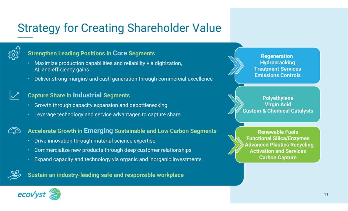 Decades of History, Adapting to Solve the Problems of the Future New Management Team Catalyst Chem32 Pioneered Regeneration Products Focused on Executing Process Launched IPO Acquisition Growth Strategy 2023 & 2021 1880s – 1890s 1950s–1980s 1988 2020-2021 Beyond 1943 1980 2017 2021 2022 Strengthen Core First Sulfuric Acid Plant Build out of Zeolyst Joint Divestiture of Potters Transition to Business and Invest in and Beginning of Oldest Ecoservices Plant Venture Formed and PQ Businesses Ecovyst Emerging Technologies Customer Relationship Network 10