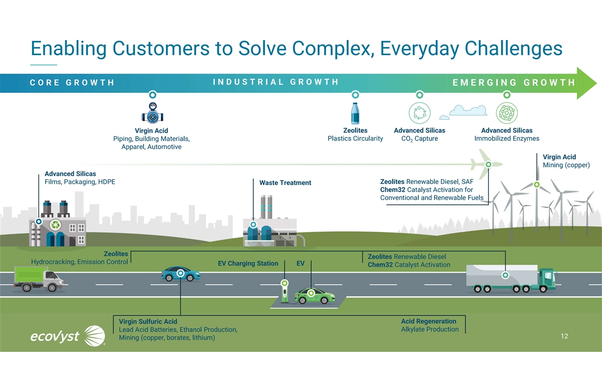 Strategy for Creating Shareholder Value Strengthen Leading Positions in Core Segments Regeneration Hydrocracking • Maximize production capabilities and reliability via digitization, Treatment Services AI, and efficiency gains Emissions Controls • Deliver strong margins and cash generation through commercial excellence Capture Share in Industrial Segments Polyethylene Virgin Acid • Growth through capacity expansion and debottlenecking Custom & Chemical Catalysts • Leverage technology and service advantages to capture share Accelerate Growth in Emerging Sustainable and Low Carbon Segments Renewable Fuels Functional Silica/Enzymes • Drive innovation through material science expertise Advanced Plastics Recycling • Commercialize new products through deep customer relationships Activation and Services Carbon Capture • Expand capacity and technology via organic and inorganic investments Sustain an industry-leading safe and responsible workplace 11
