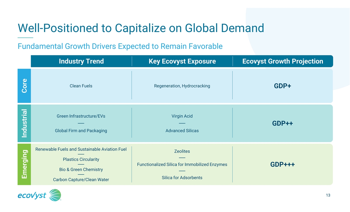 Enabling Customers to Solve Complex, Everyday Challenges I N D U S T R I A L G R O W T H C O R E G R O W T H E M E R G I N G G R O W T H Virgin Acid Zeolites Advanced Silicas Advanced Silicas Plastics Circularity CO Capture Immobilized Enzymes Piping, Building Materials, 2 Apparel, Automotive Virgin Acid Mining (copper) Advanced Silicas Films, Packaging, HDPE Zeolites Renewable Diesel, SAF Waste Treatment Chem32 Catalyst Activation for Conventional and Renewable Fuels Zeolites Zeolites Renewable Diesel Hydrocracking, Emission Control EV Charging Station EV Chem32 Catalyst Activation Virgin Sulfuric Acid Acid Regeneration Alkylate Production Lead Acid Batteries, Ethanol Production, 12 Mining (copper, borates, lithium)