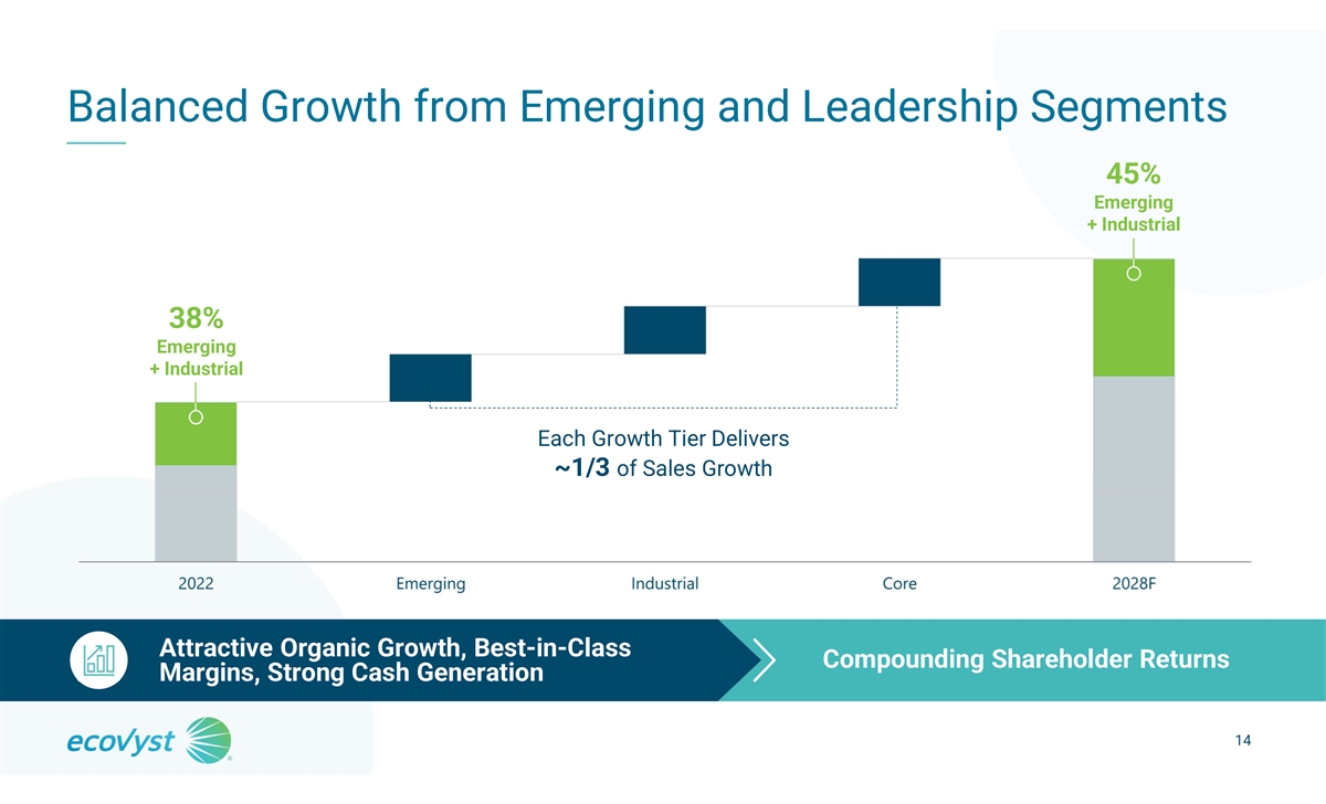 Well-Positioned to Capitalize on Global Demand Fundamental Growth Drivers Expected to Remain Favorable Industry Trend Key Ecovyst Exposure Ecovyst Growth Projection Clean Fuels Regeneration, Hydrocracking GDP+ Green Infrastructure/EVs Virgin Acid GDP++ Global Firm and Packaging Advanced Silicas Renewable Fuels and Sustainable Aviation Fuel Zeolites Plastics Circularity Functionalized Silica for Immobilized Enzymes GDP+++ Bio & Green Chemistry Silica for Adsorbents Carbon Capture/Clean Water 13 Emerging Industrial Core