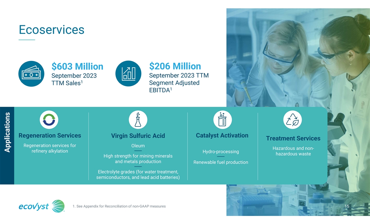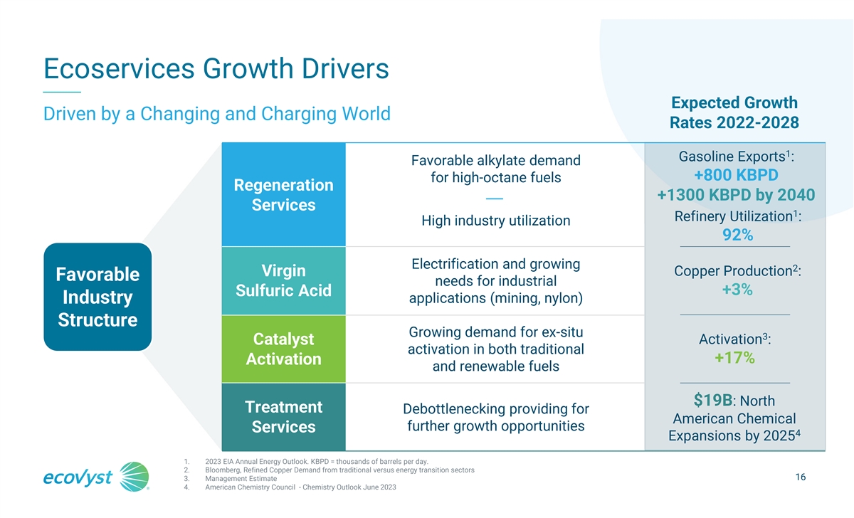 Ecoservices $603 Million $206 Million September 2023 TTM September 2023 1 Segment Adjusted TTM Sales 1 EBITDA Regeneration Services Catalyst Activation Virgin Sulfuric Acid Treatment Services Regeneration services for Oleum Hazardous and non- refinery alkylation Hydro-processing hazardous waste High strength for mining minerals and metals production Renewable fuel production Electrolyte grades (for water treatment, semiconductors, and lead acid batteries) 1. See Appendix for Reconciliation of non-GAAP measures 15 Applications