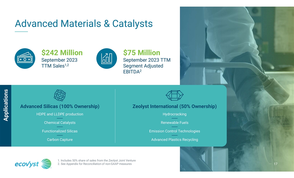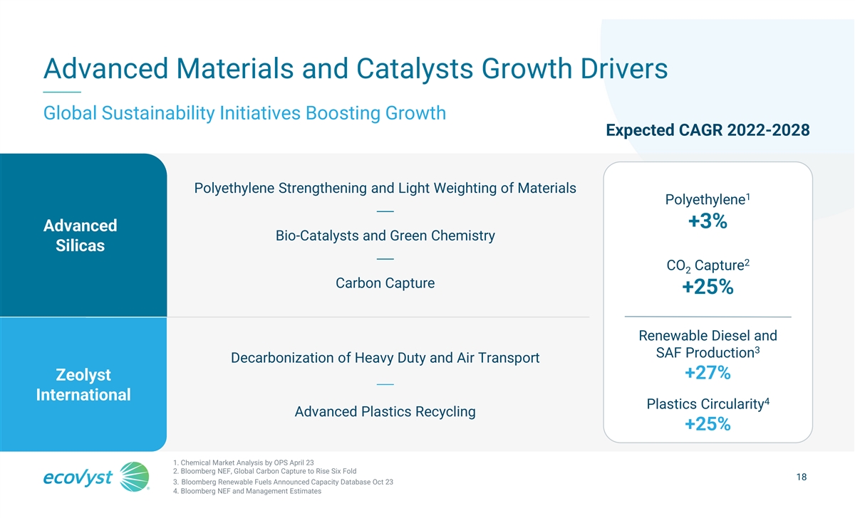 Advanced Materials & Catalysts $242 Million $75 Million September 2023 September 2023 TTM 1,2 TTM Sales Segment Adjusted 2 EBITDA Advanced Silicas (100% Ownership) Zeolyst International (50% Ownership) HDPE and LLDPE production Hydrocracking Chemical Catalysts Renewable Fuels Functionalized Silicas Emission Control Technologies Carbon Capture Advanced Plastics Recycling 1. Includes 50% share of sales from the Zeolyst Joint Venture 2. See Appendix for Reconciliation of non-GAAP measures 17 Applications