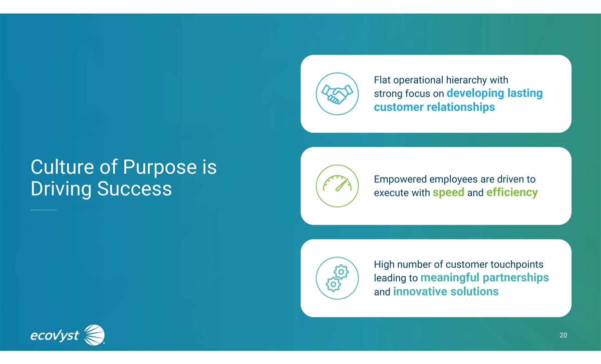 Flat operational hierarchy with strong focus on developing lasting customer relationships Culture of Purpose is Empowered employees are driven to Driving Success execute with speed and efficiency High number of customer touchpoints leading to meaningful partnerships and innovative solutions 20