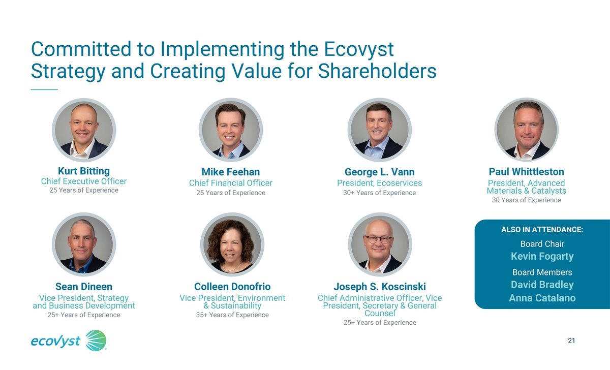 Committed to Implementing the Ecovyst Strategy and Creating Value for Shareholders Kurt Bitting Mike Feehan George L. Vann Paul Whittleston Chief Executive Officer Chief Financial Officer President, Ecoservices President, Advanced 25 Years of Experience Materials & Catalysts 25 Years of Experience 30+ Years of Experience 30 Years of Experience ALSO IN ATTENDANCE: Board Chair Kevin Fogarty Board Members David Bradley Sean Dineen Colleen Donofrio Joseph S. Koscinski Vice President, Strategy Vice President, Environment Chief Administrative Officer, Vice Anna Catalano and Business Development & Sustainability President, Secretary & General Counsel 25+ Years of Experience 35+ Years of Experience 25+ Years of Experience 21