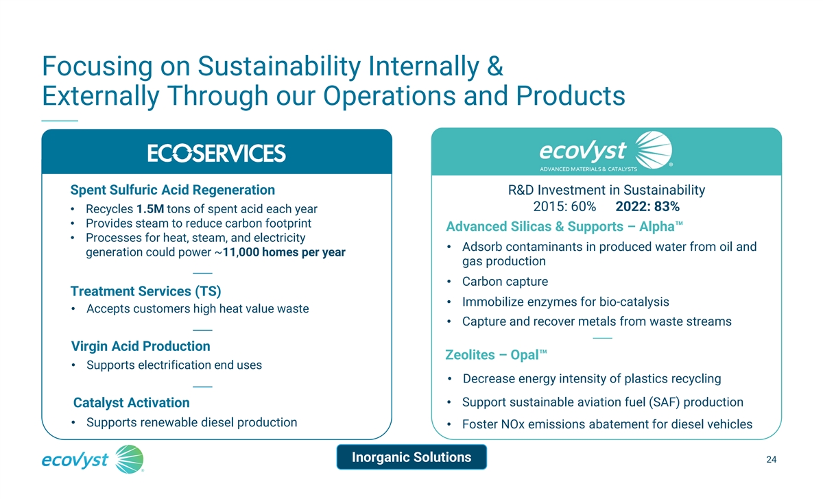 Focusing on Sustainability Internally & Externally Through our Operations and Products Spent Sulfuric Acid Regeneration R&D Investment in Sustainability 2015: 60% 2022: 83% • Recycles 1.5M tons of spent acid each year • Provides steam to reduce carbon footprint Advanced Silicas & Supports – Alpha™ • Processes for heat, steam, and electricity • Adsorb contaminants in produced water from oil and generation could power ~11,000 homes per year gas production • Carbon capture Treatment Services (TS) • Immobilize enzymes for bio-catalysis • Accepts customers high heat value waste • Capture and recover metals from waste streams Virgin Acid Production Zeolites – Opal™ • Supports electrification end uses • Decrease energy intensity of plastics recycling • Support sustainable aviation fuel (SAF) production Catalyst Activation • Supports renewable diesel production • Foster NOx emissions abatement for diesel vehicles Inorganic Solutions 24