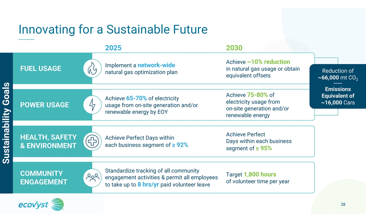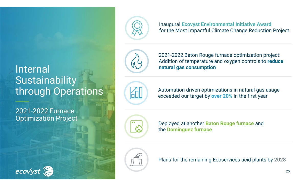 Inaugural Ecovyst Environmental Initiative Award for the Most Impactful Climate Change Reduction Project 2021-2022 Baton Rouge furnace optimization project: Addition of temperature and oxygen controls to reduce natural gas consumption I In nt te er rn na all S Su us st ta aiin na ab biilliit ty y Automation driven optimizations in natural gas usage t th hr ro ou ug gh h O Op pe er ra at tiio on ns s exceeded our target by over 20% in the first year 2 20 02 21 1- -2 20 02 22 2 F Fu ur rn na ac ce e O Op pt tiim miiz za at tiio on n P Pr ro ojje ec ct t Deployed at another Baton Rouge furnace and the Dominguez furnace Plans for the remaining Ecoservices acid plants by 2028 25