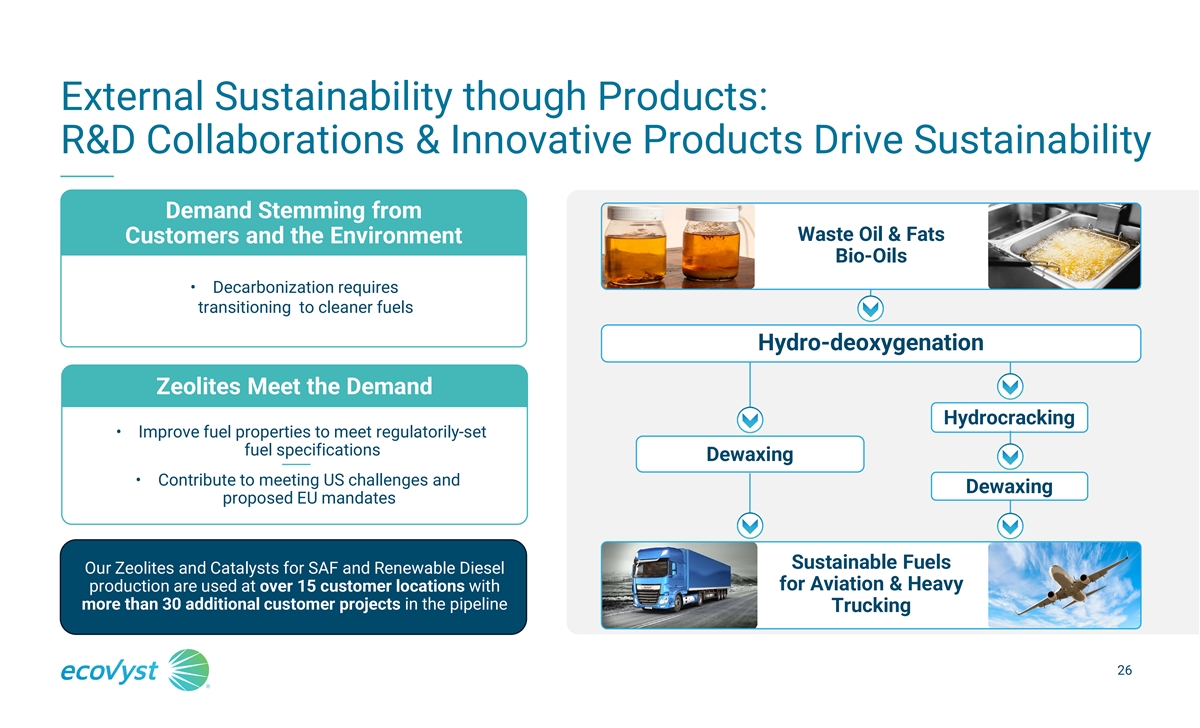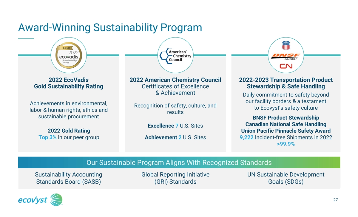 External Sustainability though Products: R&D Collaborations & Innovative Products Drive Sustainability Demand Stemming from Waste Oil & Fats Customers and the Environment Bio-Oils • Decarbonization requires transitioning to cleaner fuels Hydro-deoxygenation Zeolites Meet the Demand Hydrocracking • Improve fuel properties to meet regulatorily-set fuel specifications Dewaxing • Contribute to meeting US challenges and Dewaxing proposed EU mandates Sustainable Fuels Our Zeolites and Catalysts for SAF and Renewable Diesel for Aviation & Heavy production are used at over 15 customer locations with more than 30 additional customer projects in the pipeline Trucking 26