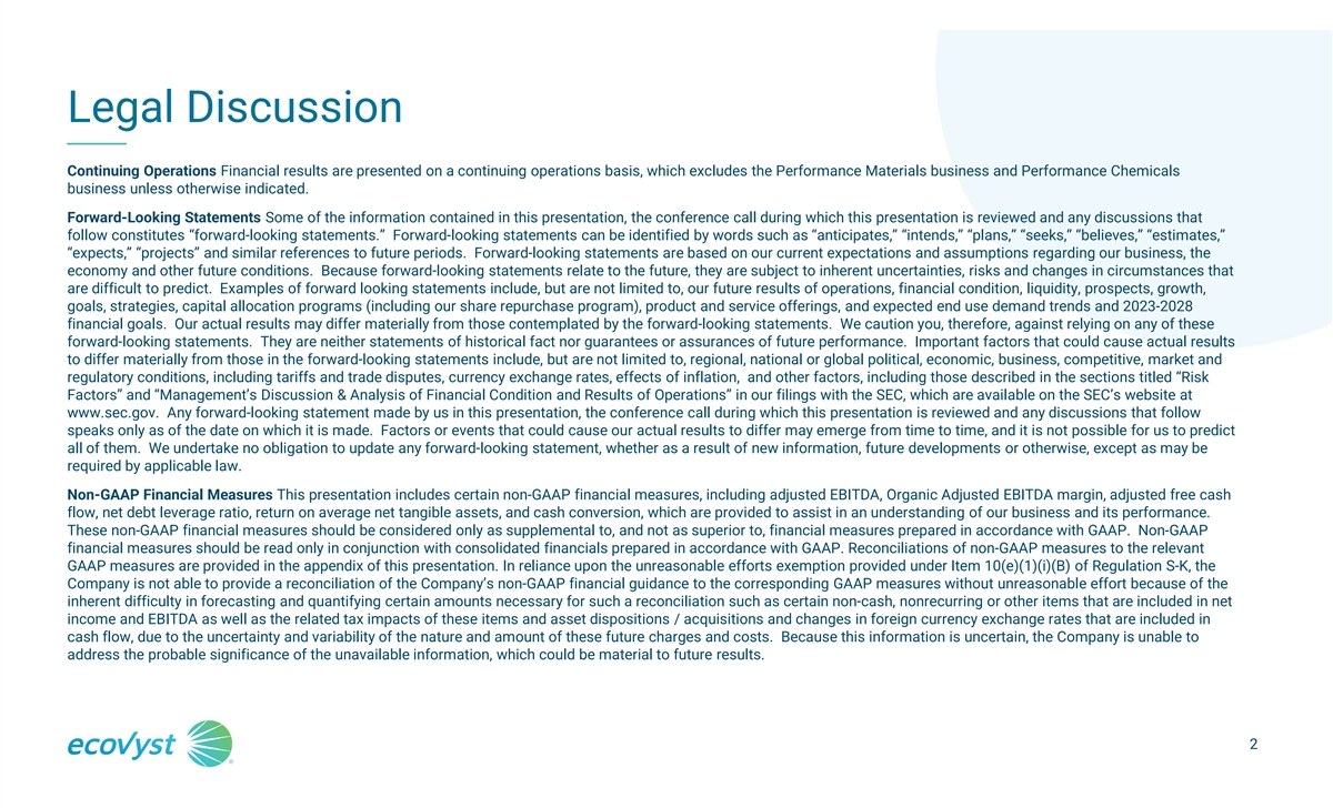 Legal Discussion Continuing Operations Financial results are presented on a continuing operations basis, which excludes the Performance Materials business and Performance Chemicals business unless otherwise indicated. Forward-Looking Statements Some of the information contained in this presentation, the conference call during which this presentation is reviewed and any discussions that follow constitutes “forward-looking statements.” Forward-looking statements can be identified by words such as “anticipates,” “intends,” “plans,” “seeks,” “believes,” “estimates,” “expects,” “projects” and similar references to future periods. Forward-looking statements are based on our current expectations and assumptions regarding our business, the economy and other future conditions. Because forward-looking statements relate to the future, they are subject to inherent uncertainties, risks and changes in circumstances that are difficult to predict. Examples of forward looking statements include, but are not limited to, our future results of operations, financial condition, liquidity, prospects, growth, goals, strategies, capital allocation programs (including our share repurchase program), product and service offerings, and expected end use demand trends and 2023-2028 financial goals. Our actual results may differ materially from those contemplated by the forward-looking statements. We caution you, therefore, against relying on any of these forward-looking statements. They are neither statements of historical fact nor guarantees or assurances of future performance. Important factors that could cause actual results to differ materially from those in the forward-looking statements include, but are not limited to, regional, national or global political, economic, business, competitive, market and regulatory conditions, including tariffs and trade disputes, currency exchange rates, effects of inflation, and other factors, including those described in the sections titled “Risk Factors” and “Management’s Discussion & Analysis of Financial Condition and Results of Operations” in our filings with the SEC, which are available on the SEC’s website at www.sec.gov. Any forward-looking statement made by us in this presentation, the conference call during which this presentation is reviewed and any discussions that follow speaks only as of the date on which it is made. Factors or events that could cause our actual results to differ may emerge from time to time, and it is not possible for us to predict all of them. We undertake no obligation to update any forward-looking statement, whether as a result of new information, future developments or otherwise, except as may be required by applicable law. Non-GAAP Financial Measures This presentation includes certain non-GAAP financial measures, including adjusted EBITDA, Organic Adjusted EBITDA margin, adjusted free cash flow, net debt leverage ratio, return on average net tangible assets, and cash conversion, which are provided to assist in an understanding of our business and its performance. These non-GAAP financial measures should be considered only as supplemental to, and not as superior to, financial measures prepared in accordance with GAAP. Non-GAAP financial measures should be read only in conjunction with consolidated financials prepared in accordance with GAAP. Reconciliations of non-GAAP measures to the relevant GAAP measures are provided in the appendix of this presentation. In reliance upon the unreasonable efforts exemption provided under Item 10(e)(1)(i)(B) of Regulation S-K, the Company is not able to provide a reconciliation of the Company’s non-GAAP financial guidance to the corresponding GAAP measures without unreasonable effort because of the inherent difficulty in forecasting and quantifying certain amounts necessary for such a reconciliation such as certain non-cash, nonrecurring or other items that are included in net income and EBITDA as well as the related tax impacts of these items and asset dispositions / acquisitions and changes in foreign currency exchange rates that are included in cash flow, due to the uncertainty and variability of the nature and amount of these future charges and costs. Because this information is uncertain, the Company is unable to address the probable significance of the unavailable information, which could be material to future results. 2