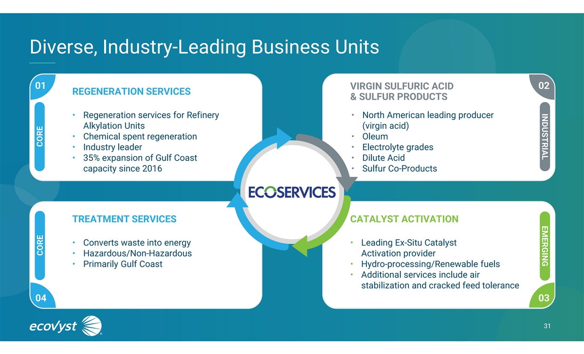 INDUSTRIAL EMERGING Diverse, Industry-Leading Business Units 01 02 VIRGIN SULFURIC ACID REGENERATION SERVICES & SULFUR PRODUCTS • Regeneration services for Refinery • North American leading producer Alkylation Units (virgin acid) • Chemical spent regeneration • Oleum • Industry leader • Electrolyte grades • 35% expansion of Gulf Coast • Dilute Acid capacity since 2016 • Sulfur Co-Products TREATMENT SERVICES CATALYST ACTIVATION • Converts waste into energy • Leading Ex-Situ Catalyst • Hazardous/Non-Hazardous Activation provider • Primarily Gulf Coast • Hydro-processing/Renewable fuels • Additional services include air stabilization and cracked feed tolerance 04 03 31 CORE CORE