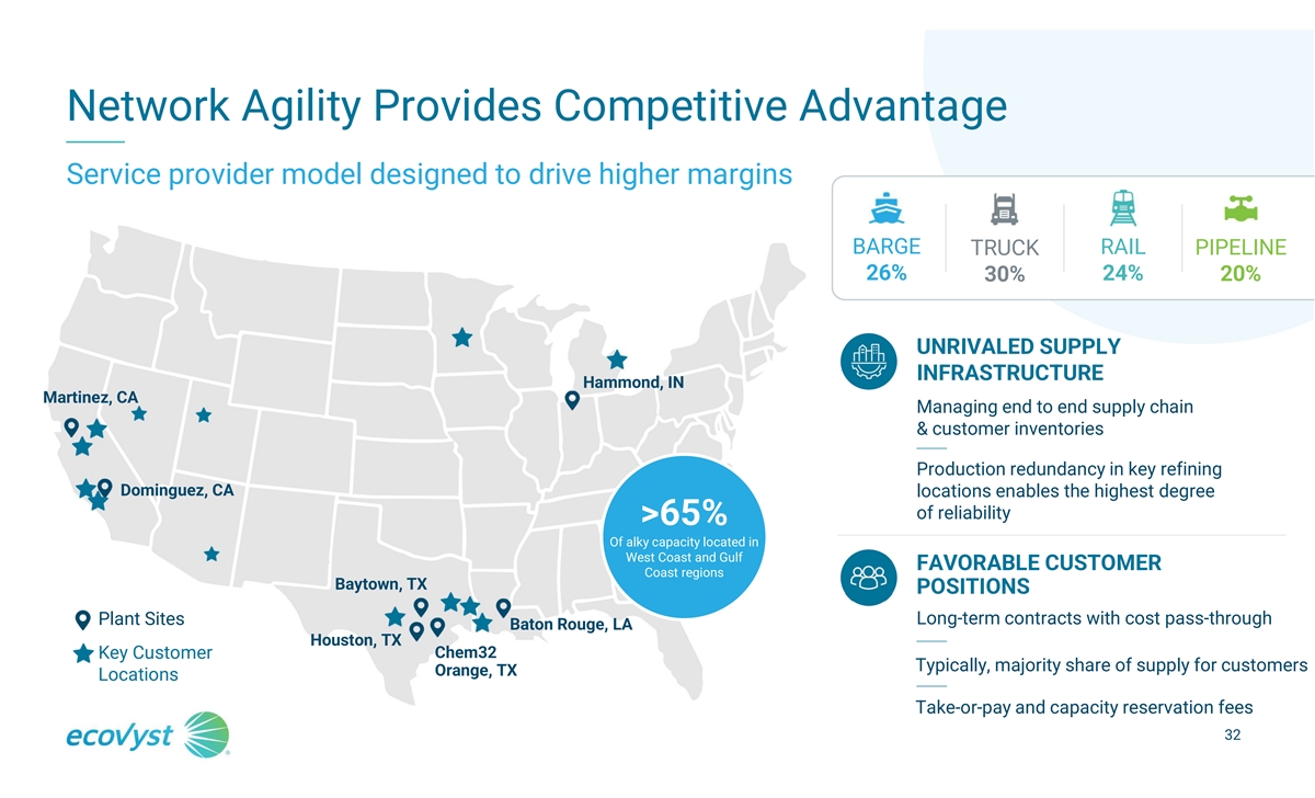 Network Agility Provides Competitive Advantage Service provider model designed to drive higher margins BARGE RAIL PIPELINE TRUCK 26% 24% 30% 20% UNRIVALED SUPPLY INFRASTRUCTURE Hammond, IN Martinez, CA Managing end to end supply chain & customer inventories Production redundancy in key refining Dominguez, CA locations enables the highest degree of reliability >65% Of alky capacity located in West Coast and Gulf FAVORABLE CUSTOMER Coast regions Baytown, TX POSITIONS Plant Sites Long-term contracts with cost pass-through Baton Rouge, LA Houston, TX Key Customer Chem32 Typically, majority share of supply for customers Orange, TX Locations Take-or-pay and capacity reservation fees 32
