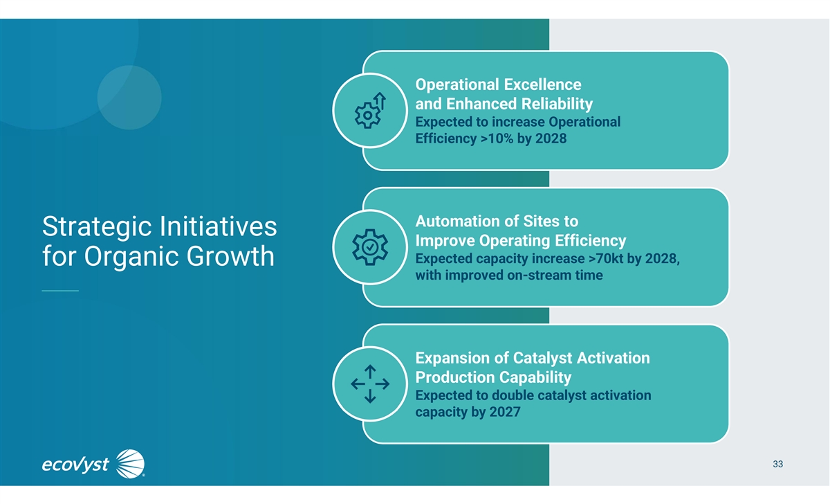 Operational Excellence and Enhanced Reliability Expected to increase Operational Efficiency >10% by 2028 Automation of Sites to Strategic Initiatives Improve Operating Efficiency Expected capacity increase >70kt by 2028, for Organic Growth with improved on-stream time Expansion of Catalyst Activation Production Capability Expected to double catalyst activation capacity by 2027 33