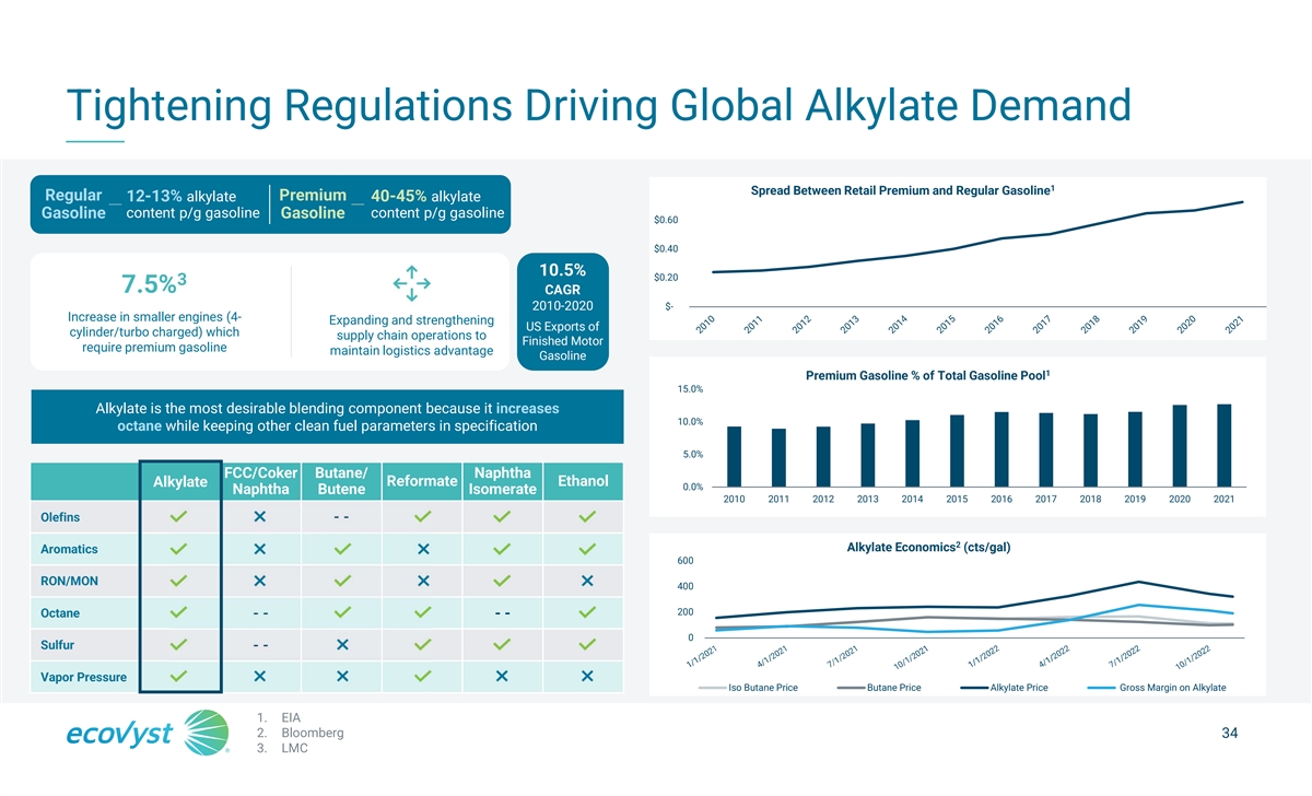Tightening Regulations Driving Global Alkylate Demand 1 Spread Between Retail Premium and Regular Gasoline Regular Premium 12-13% alkylate 40-45% alkylate Gasoline content p/g gasoline Gasoline content p/g gasoline $0.60 $0.40 10.5% $0.20 3 7.5% CAGR $- 2010-2020 Increase in smaller engines (4- Expanding and strengthening US Exports of cylinder/turbo charged) which supply chain operations to Finished Motor require premium gasoline maintain logistics advantage Gasoline 1 Premium Gasoline % of Total Gasoline Pool 15.0% Alkylate is the most desirable blending component because it increases 10.0% octane while keeping other clean fuel parameters in specification 5.0% FCC/Coker Butane/ Naphtha Alkylate Reformate Ethanol 0.0% Naphtha Butene Isomerate 2010 2011 2012 2013 2014 2015 2016 2017 2018 2019 2020 2021 Olefins - - 2 Alkylate Economics (cts/gal) Aromatics 600 RON/MON 400 200 Octane - - - - 0 Sulfur - - Vapor Pressure Iso Butane Price Butane Price Alkylate Price Gross Margin on Alkylate 1. EIA 2. Bloomberg 34 3. LMC