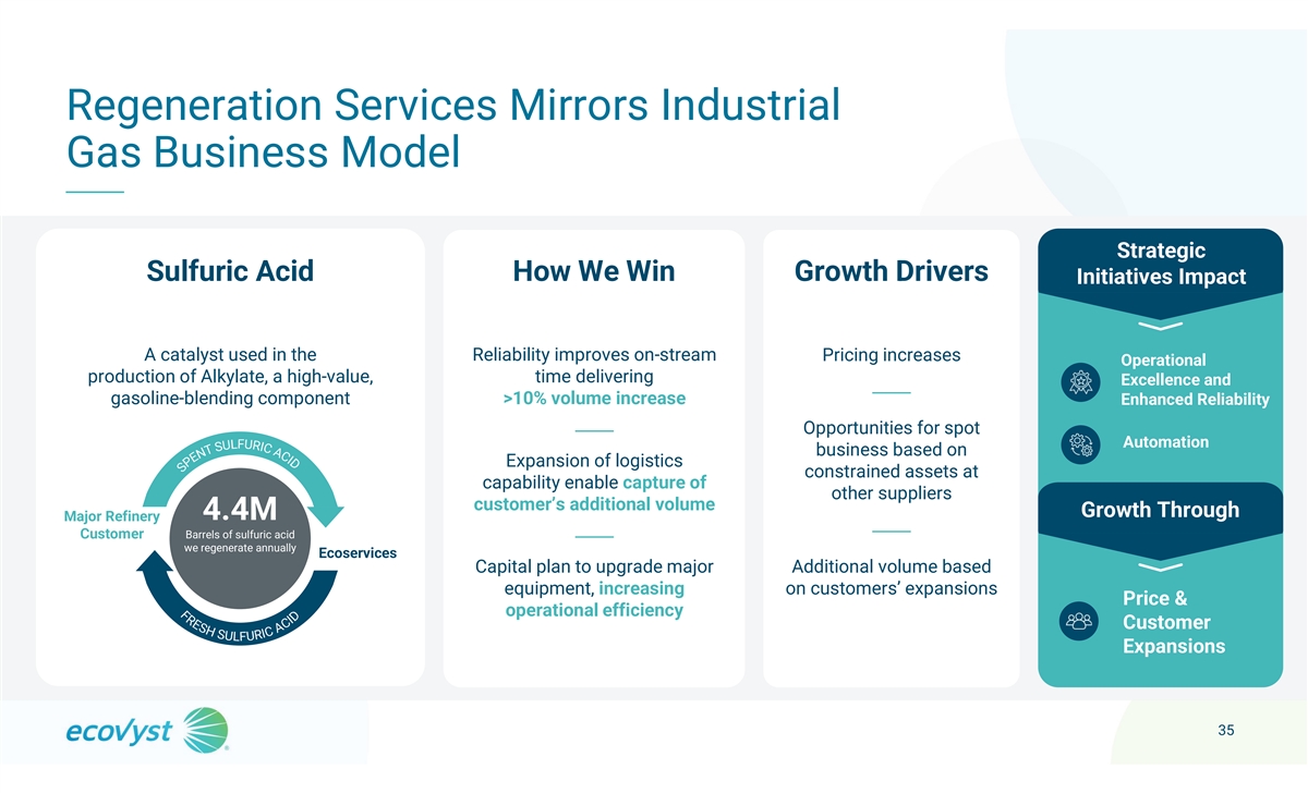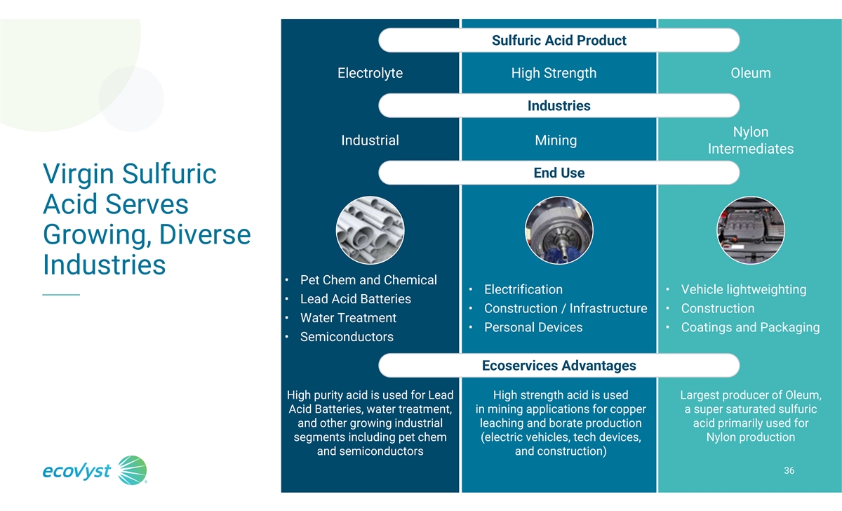Regeneration Services Mirrors Industrial Gas Business Model Strategic Sulfuric Acid How We Win Growth Drivers Initiatives Impact A catalyst used in the Reliability improves on-stream Pricing increases Operational production of Alkylate, a high-value, time delivering Excellence and gasoline-blending component >10% volume increase Enhanced Reliability Opportunities for spot Automation business based on Expansion of logistics component component component constrained assets at capability enable capture of other suppliers customer’s additional volume Growth Through 4.4M Major Refinery Customer Barrels of sulfuric acid we regenerate annually Ecoservices Capital plan to upgrade major Additional volume based equipment, increasing on customers’ expansions Price & operational efficiency Customer Expansions 35