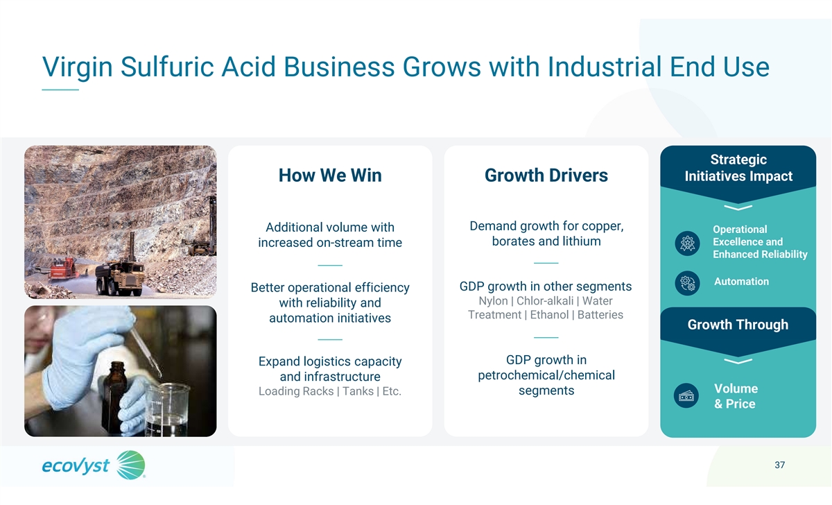 Sulfuric Acid Product Electrolyte High Strength Oleum Industries Nylon Industrial Mining Intermediates End Use Virgin Sulfuric Acid Serves Growing, Diverse Industries • Pet Chem and Chemical • Electrification • Vehicle lightweighting • Lead Acid Batteries • Construction / Infrastructure • Construction • Water Treatment • Personal Devices • Coatings and Packaging • Semiconductors Ecoservices Advantages High purity acid is used for Lead High strength acid is used Largest producer of Oleum, Acid Batteries, water treatment, in mining applications for copper a super saturated sulfuric and other growing industrial leaching and borate production acid primarily used for segments including pet chem (electric vehicles, tech devices, Nylon production and semiconductors and construction) 36