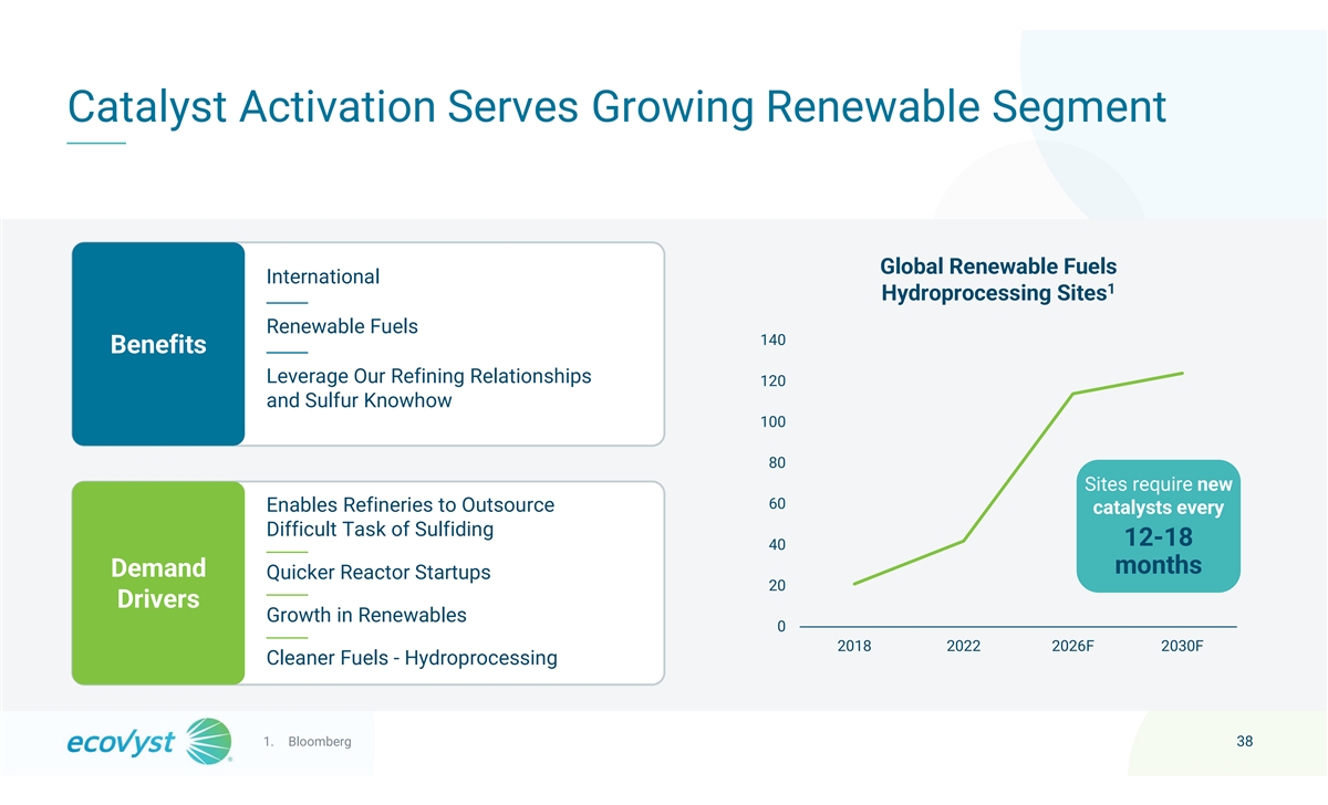 Catalyst Activation Serves Growing Renewable Segment Global Renewable Fuels International 1 Hydroprocessing Sites Renewable Fuels 140 Benefits Leverage Our Refining Relationships 120 and Sulfur Knowhow 100 80 Sites require new 60 Enables Refineries to Outsource catalysts every Difficult Task of Sulfiding 12-18 40 months Demand Quicker Reactor Startups 20 Drivers Growth in Renewables 0 2018 2022 2026F 2030F Cleaner Fuels - Hydroprocessing 1. Bloomberg 38