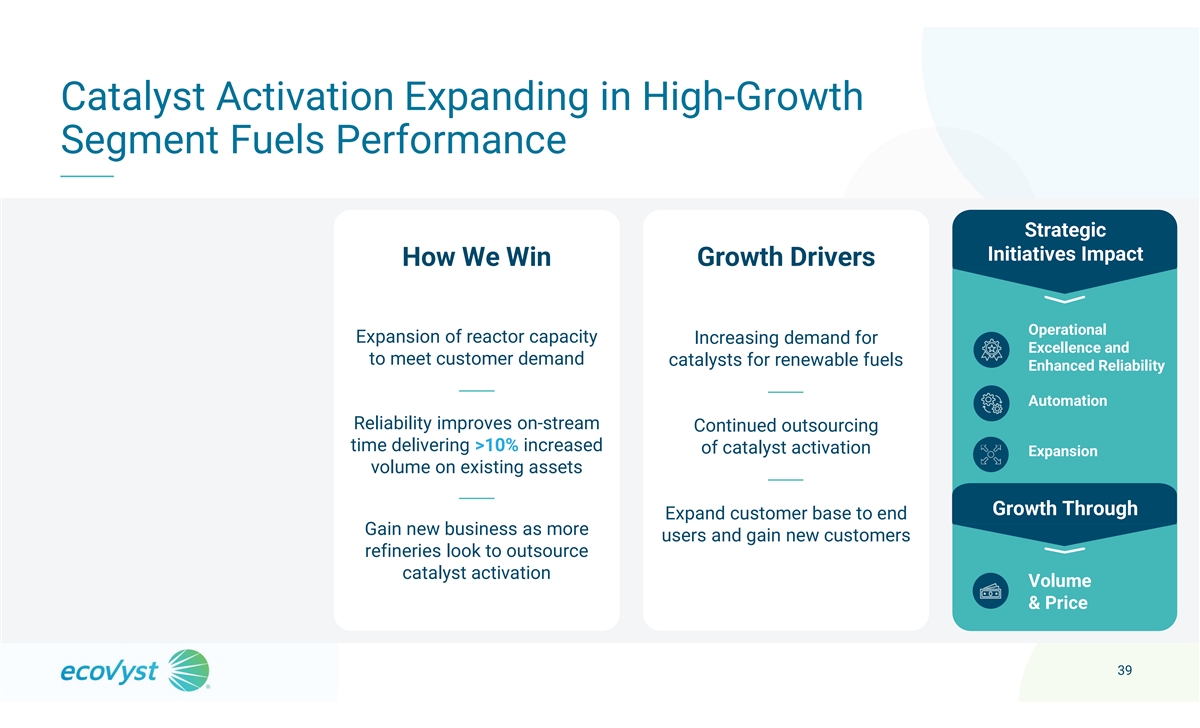 Catalyst Activation Expanding in High-Growth Segment Fuels Performance Strategic Initiatives Impact How We Win Growth Drivers Operational Expansion of reactor capacity Increasing demand for Excellence and to meet customer demand catalysts for renewable fuels Enhanced Reliability Automation Reliability improves on-stream Continued outsourcing time delivering >10% increased of catalyst activation Expansion volume on existing assets Growth Through Expand customer base to end Gain new business as more users and gain new customers refineries look to outsource catalyst activation Volume & Price 39