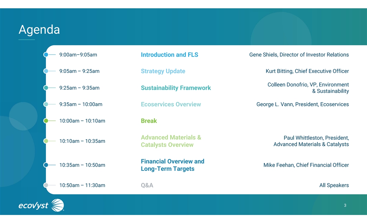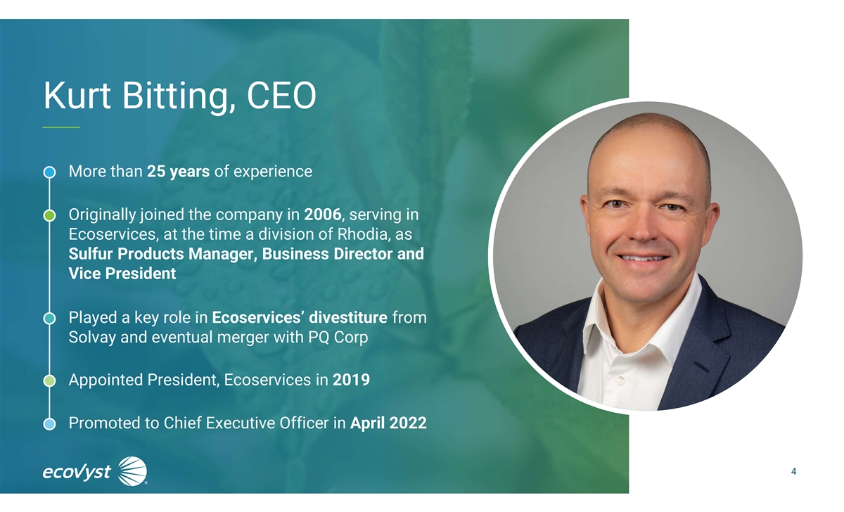 Agenda 9:00am–9:05am Gene Shiels, Director of Investor Relations Introduction and FLS 9:05am – 9:25am Kurt Bitting, Chief Executive Officer Strategy Update Colleen Donofrio, VP, Environment 9:25am – 9:35am Sustainability Framework & Sustainability 9:35am – 10:00am George L. Vann, President, Ecoservices Ecoservices Overview 10:00am – 10:10am Break Advanced Materials & Paul Whittleston, President, 10:10am – 10:35am Advanced Materials & Catalysts Catalysts Overview Financial Overview and 10:35am – 10:50am Mike Feehan, Chief Financial Officer Long-Term Targets 10:50am – 11:30am All Speakers Q&A 3