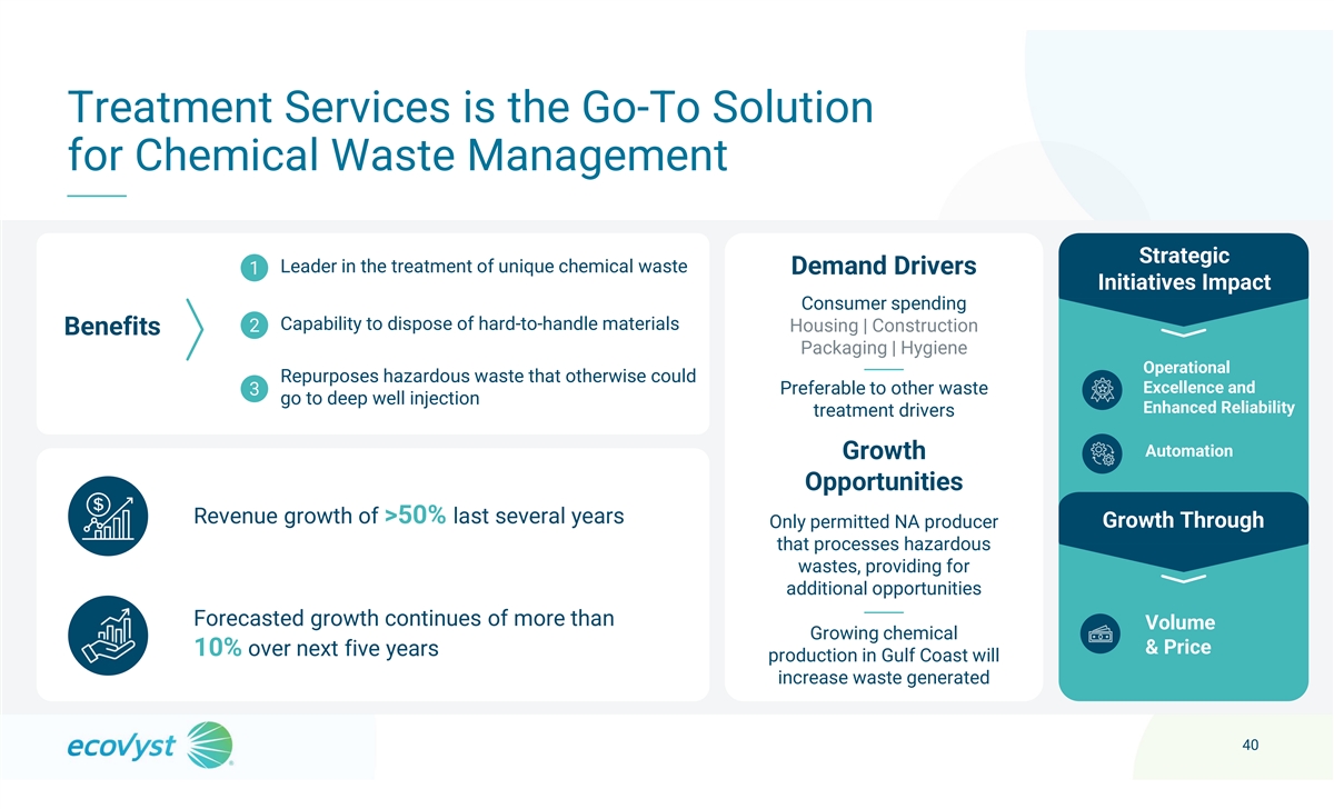 Treatment Services is the Go-To Solution for Chemical Waste Management Strategic Leader in the treatment of unique chemical waste 1 Demand Drivers Initiatives Impact Consumer spending Capability to dispose of hard-to-handle materials 2 Housing | Construction Benefits component Packaging | Hygiene Operational Repurposes hazardous waste that otherwise could Preferable to other waste Excellence and 3 go to deep well injection Enhanced Reliability treatment drivers Automation Growth component Opportunities Revenue growth of >50% last several years Growth Through Only permitted NA producer that processes hazardous wastes, providing for additional opportunities Forecasted growth continues of more than Volume Growing chemical & Price 10% over next five years production in Gulf Coast will increase waste generated 40
