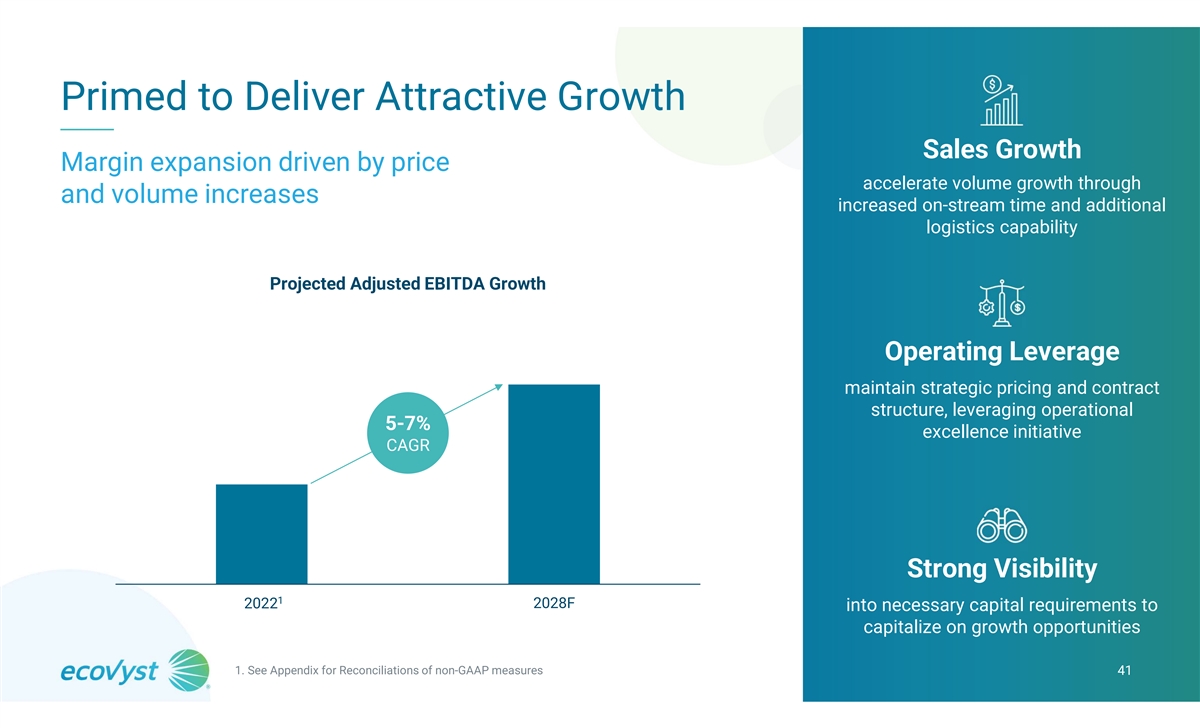 Primed to Deliver Attractive Growth Sales Growth Margin expansion driven by price accelerate volume growth through and volume increases increased on-stream time and additional logistics capability Projected Adjusted EBITDA Growth Operating Leverage maintain strategic pricing and contract structure, leveraging operational 5-7% excellence initiative CAGR Strong Visibility 1 2022 2028F 2022 into necessary capital requirements to capitalize on growth opportunities 1. See Appendix for Reconciliations of non-GAAP measures 41