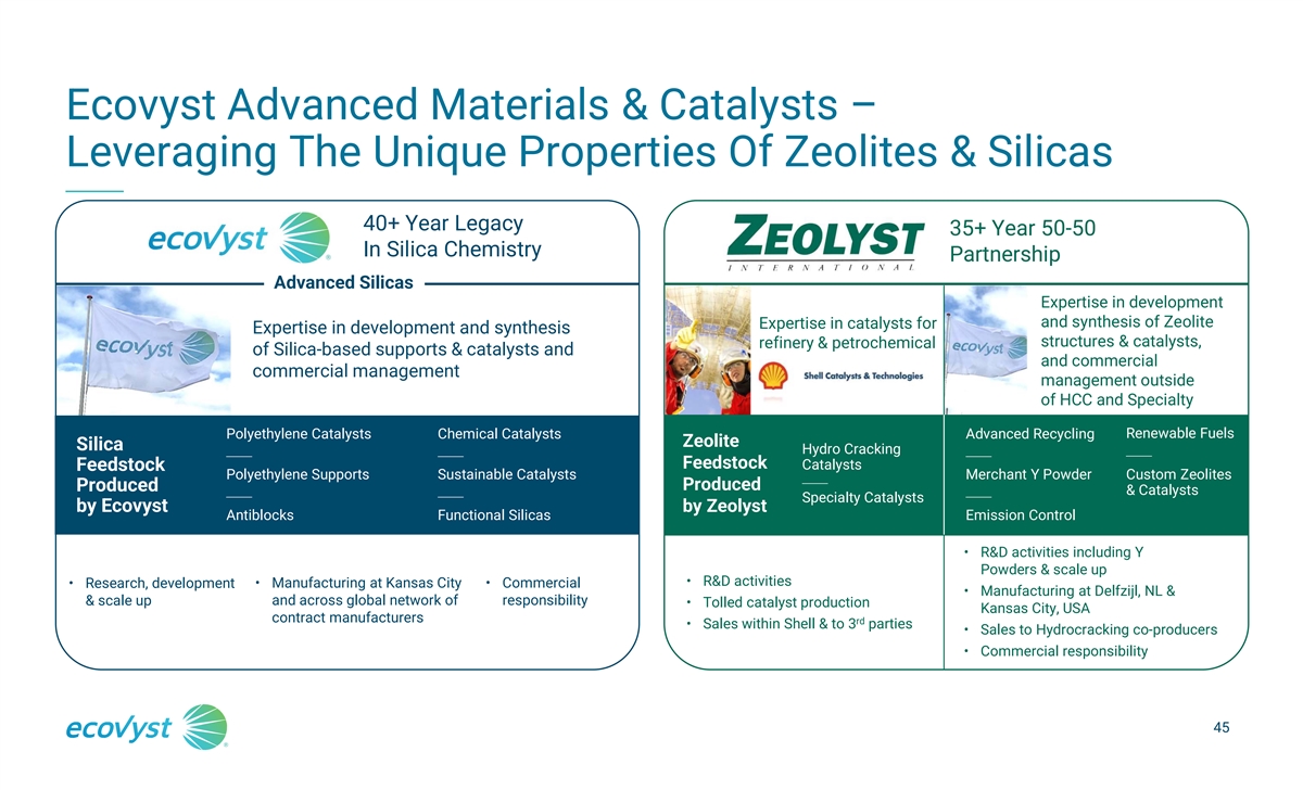 Ecovyst Advanced Materials & Catalysts – Leveraging The Unique Properties Of Zeolites & Silicas 40+ Year Legacy 35+ Year 50-50 In Silica Chemistry Partnership Advanced Silicas Expertise in development and synthesis of Zeolite Expertise in catalysts for Expertise in development and synthesis structures & catalysts, refinery & petrochemical of Silica-based supports & catalysts and and commercial commercial management management outside of HCC and Specialty Polyethylene Catalysts Chemical Catalysts Advanced Recycling Renewable Fuels Zeolite Silica Hydro Cracking Feedstock Catalysts Feedstock Polyethylene Supports Sustainable Catalysts Merchant Y Powder Custom Zeolites Produced Produced & Catalysts Specialty Catalysts by Ecovyst by Zeolyst Antiblocks Functional Silicas Emission Control • R&D activities including Y Powders & scale up • R&D activities • Manufacturing at Kansas City • Commercial • Research, development • Manufacturing at Delfzijl, NL & & scale up and across global network of responsibility • Tolled catalyst production Kansas City, USA contract manufacturers rd • Sales within Shell & to 3 parties • Sales to Hydrocracking co-producers • Commercial responsibility 45