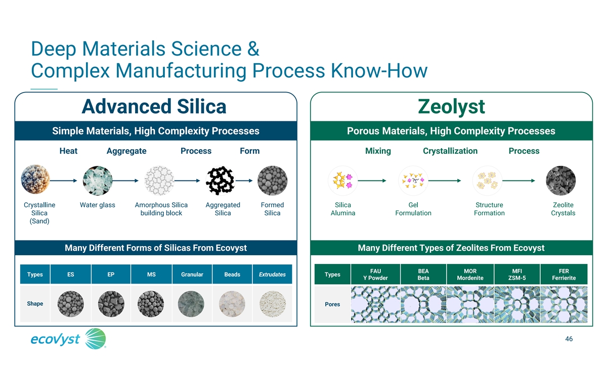 Deep Materials Science & Complex Manufacturing Process Know-How Advanced Silica Zeolyst Simple Materials, High Complexity Processes Porous Materials, High Complexity Processes Heat Aggregate Process Form Mixing Crystallization Process Crystalline Water glass Amorphous Silica Aggregated Formed Silica Gel Structure Zeolite Silica building block Silica Silica Alumina Formulation Formation Crystals (Sand) Many Different Forms of Silicas From Ecovyst Many Different Types of Zeolites From Ecovyst FAU BEA MOR MFI FER Types ES EP MS Granular BeadsExtrudates Types Y Powder Beta Mordenite ZSM-5 Ferrierite Shape Pores 46