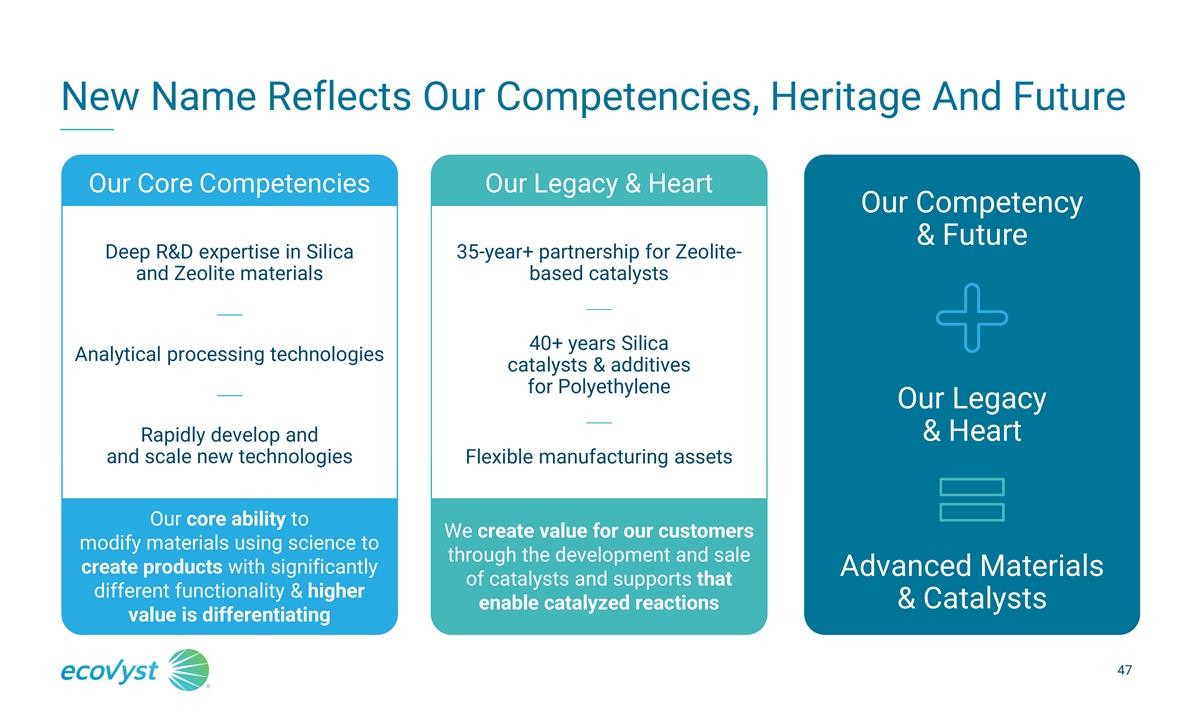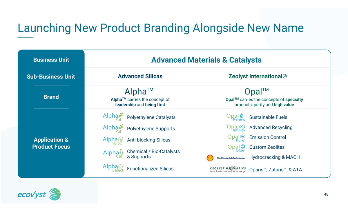 New Name Reflects Our Competencies, Heritage And Future Our Core Competencies Our Legacy & Heart Our Competency & Future Deep R&D expertise in Silica 35-year+ partnership for Zeolite- and Zeolite materials based catalysts 40+ years Silica Analytical processing technologies catalysts & additives for Polyethylene Our Legacy Rapidly develop and & Heart and scale new technologies Flexible manufacturing assets Our core ability to We create value for our customers modify materials using science to through the development and sale create products with significantly Advanced Materials of catalysts and supports that different functionality & higher & Catalysts enable catalyzed reactions value is differentiating 47